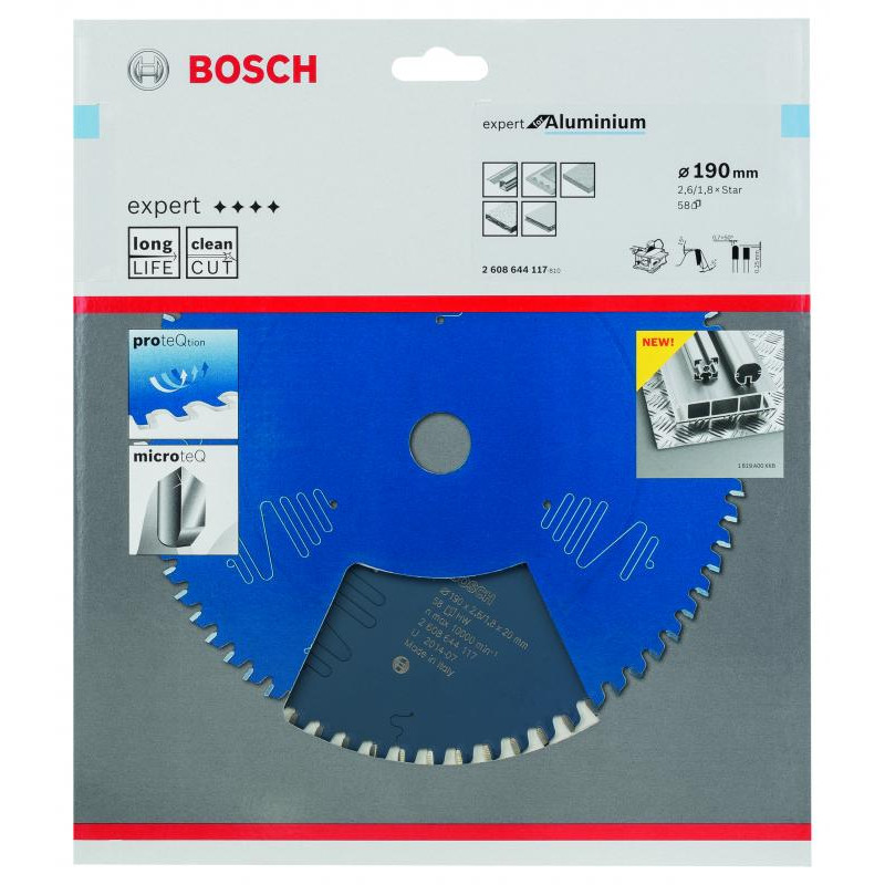 Emballage: 1Marque: BoschRéférence: 2608644117EAN: 3165140796835Description: Lame de Scie Circulaire Expert pour Aluminium, 190 x 30 x 2,6 mm, 58D
