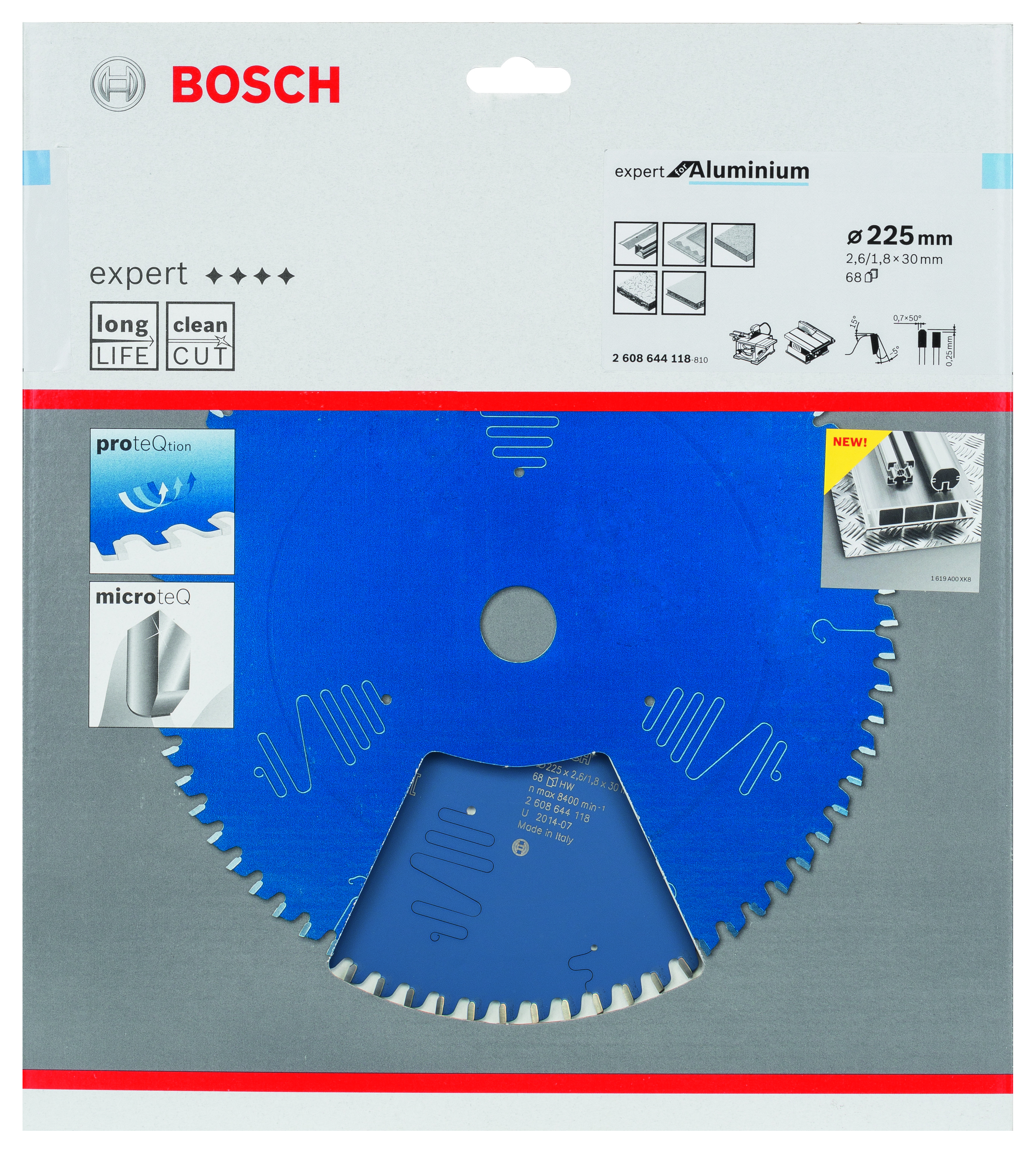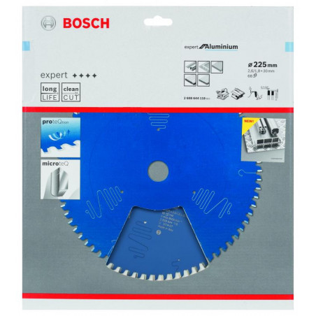 Emballage: 1Marque: BoschRéférence: 2608644118EAN: 3165140796842Description: Lame de Scie Circulaire Expert pour Aluminium, 225 x 30 x 2,6 mm, 68D