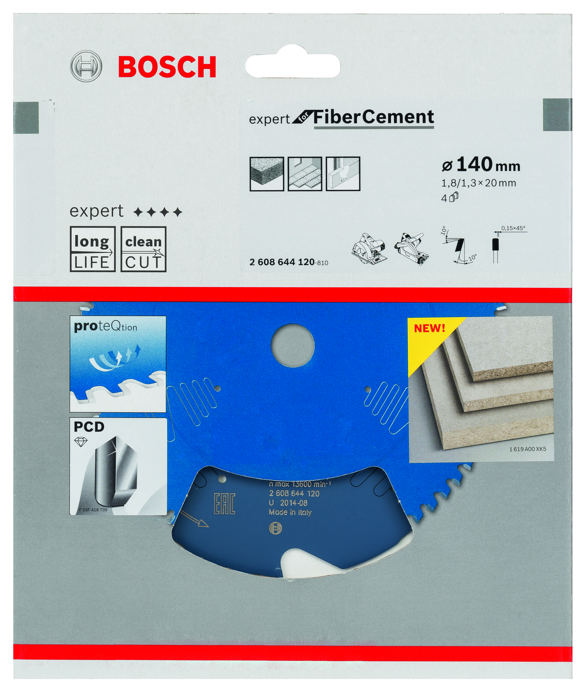 Emballage: 1 Marque: Bosch Référence: 2608644120 EAN: 3165140796866 Description: Lame de Scie Circulaire Expert pour Fiber Cement 140 x 20 x 1,8 mm, 4D