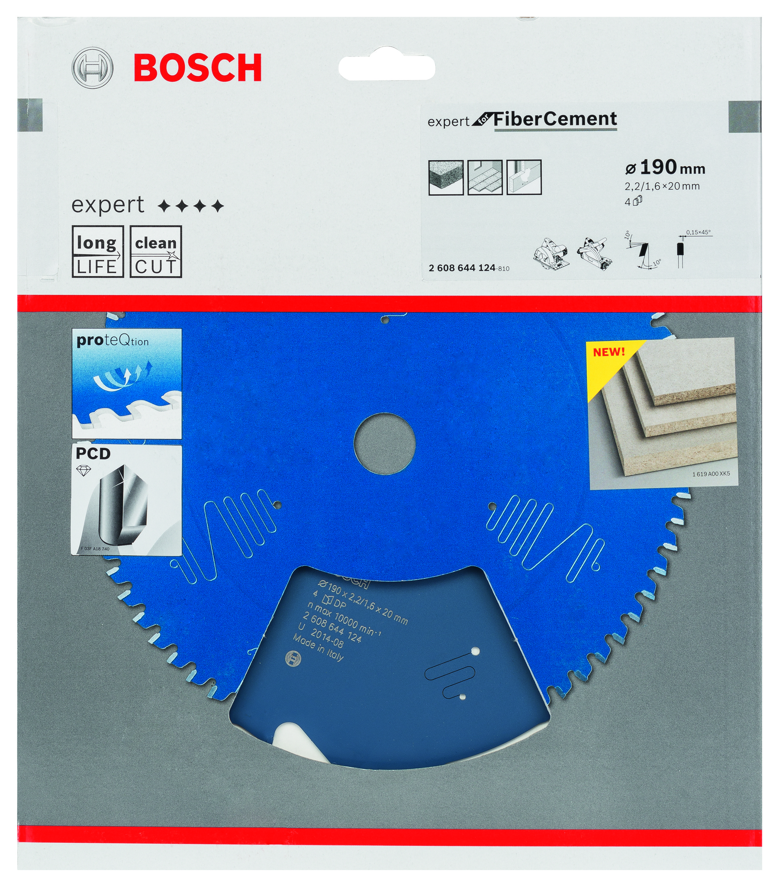Emballage: 1 Marque: Bosch Référence: 2608644124 EAN: 3165140796903 Description: Lame de Scie Circulaire Expert pour Fiber Cement 190 x 20 x 2,2 mm, 4D