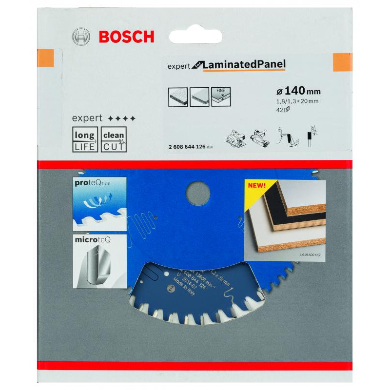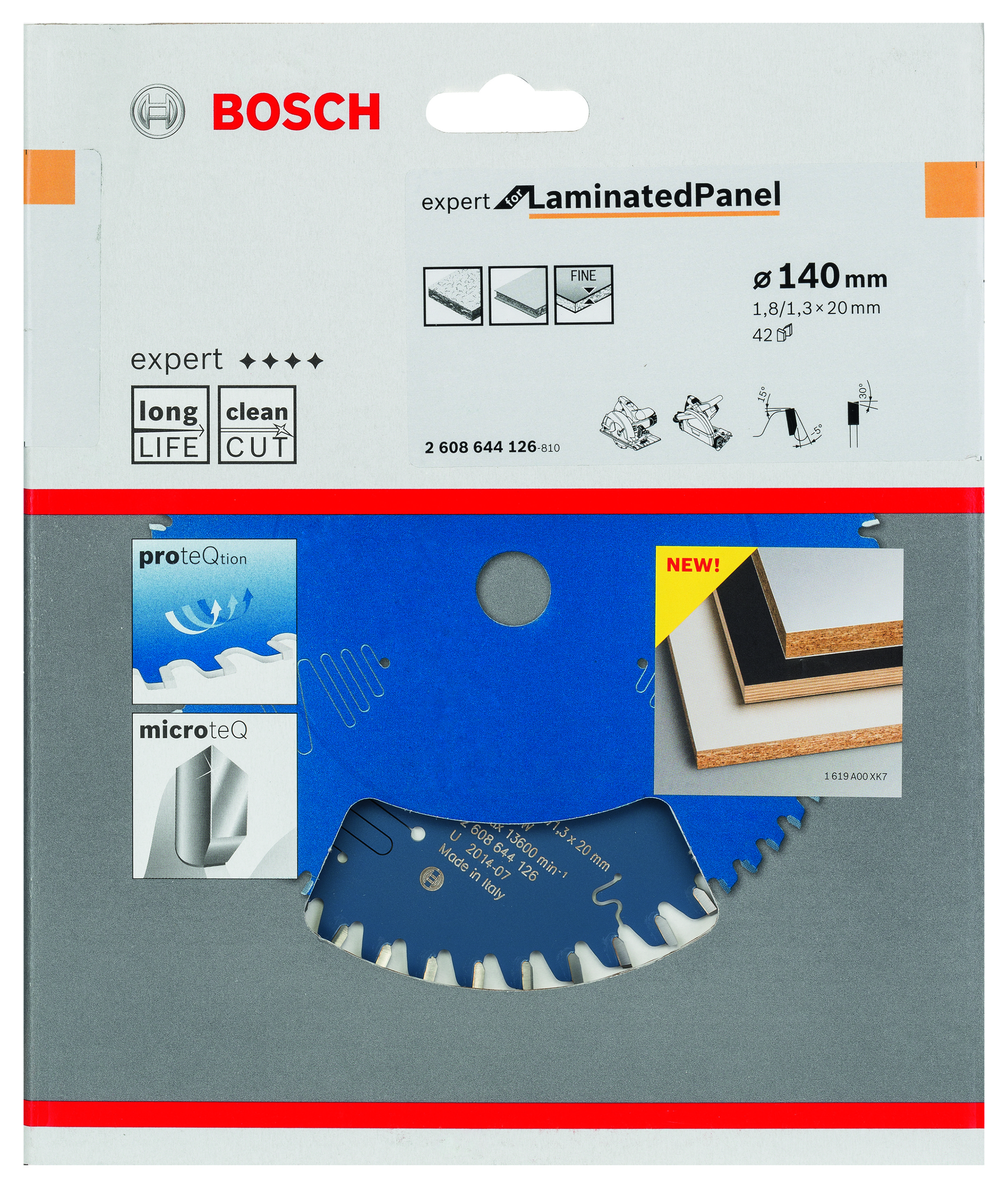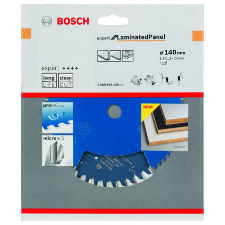 Emballage: 1 Marque: Bosch Référence: 2608644126 EAN: 3165140796927 Description: Lame de Scie Circulaire Expert pour Laminated Panel, 140 x 20 x 1,8 mm, 42D