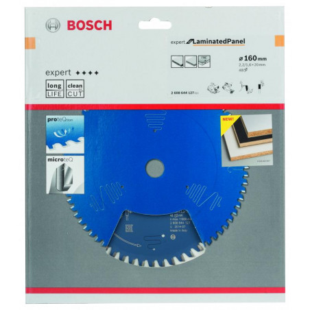 Emballage: 1 Marque: Bosch Référence: 2608644127 EAN: 3165140796934 Description: Lame de Scie Circulaire Expert pour Laminated Panel, 160 x 20 x 2,2 mm, 48D