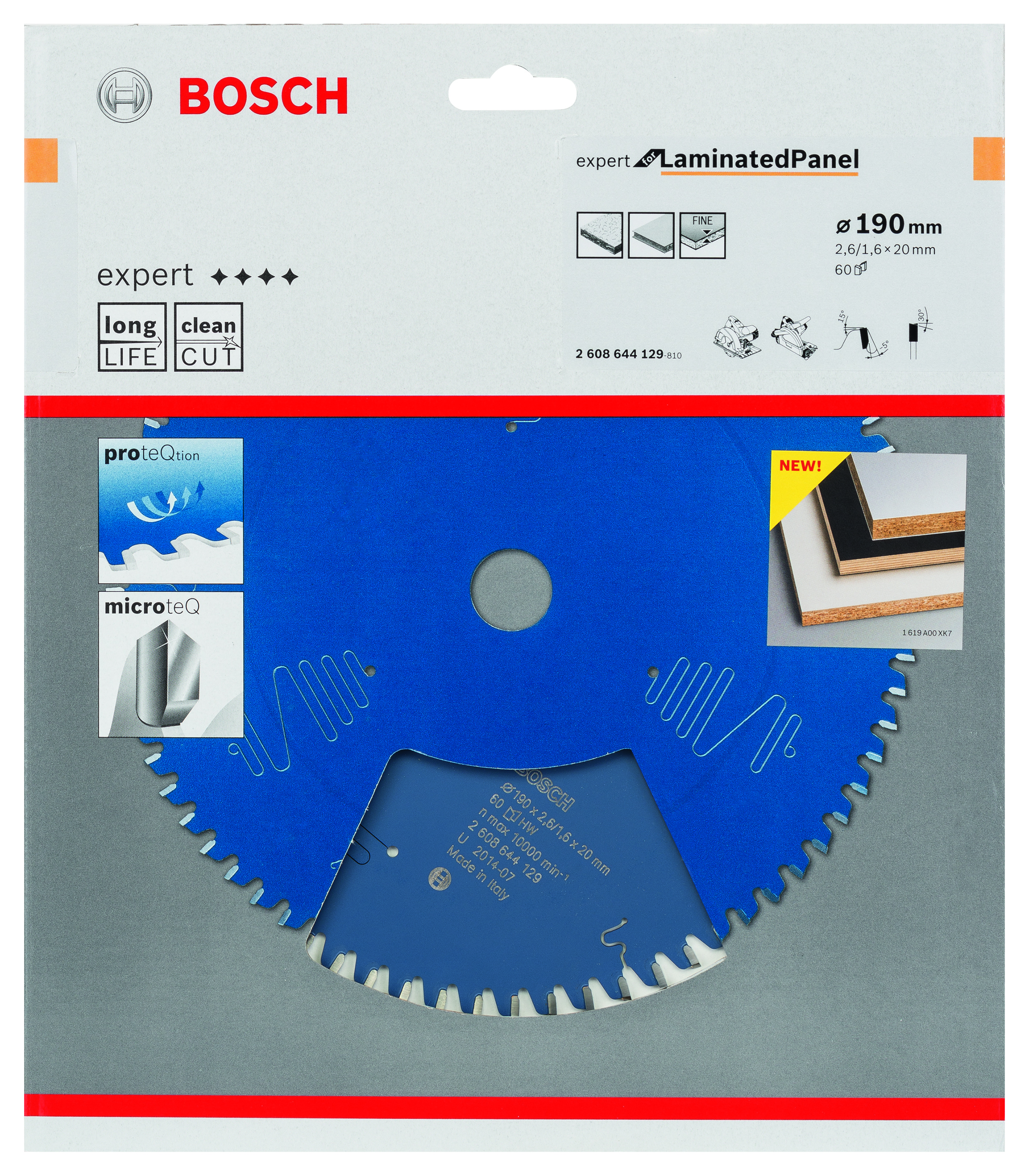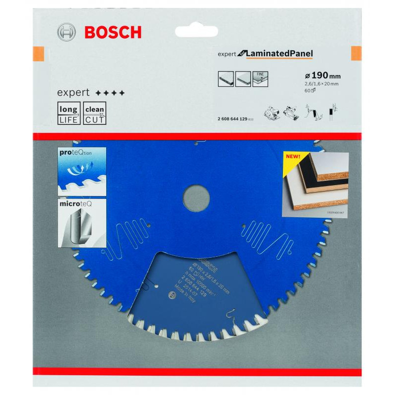 Emballage: 1 Marque: Bosch Référence: 2608644129 EAN: 3165140796958 Description: Lame de Scie Circulaire Expert pour Laminated Panel, 190 x 20 x 2,6 mm, 60D
