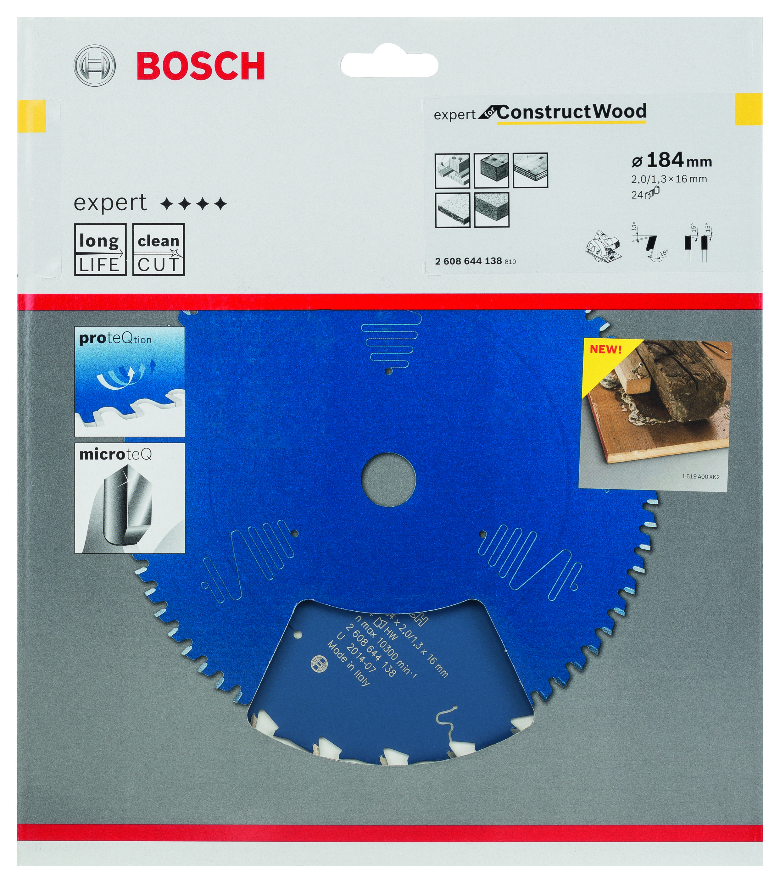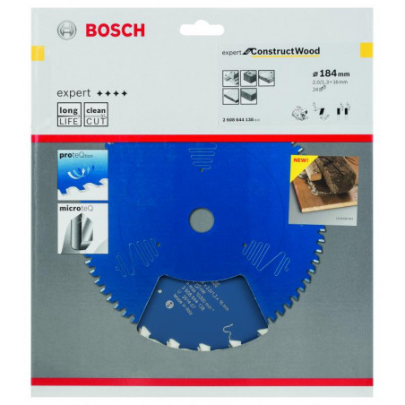 Emballage: 1 Marque: Bosch Référence: 2608644138 EAN: 3165140797047 Description: Lame de Scie Circulaire Expert pour Construct Wood, 184 x 16 x 2 mm, 24D
