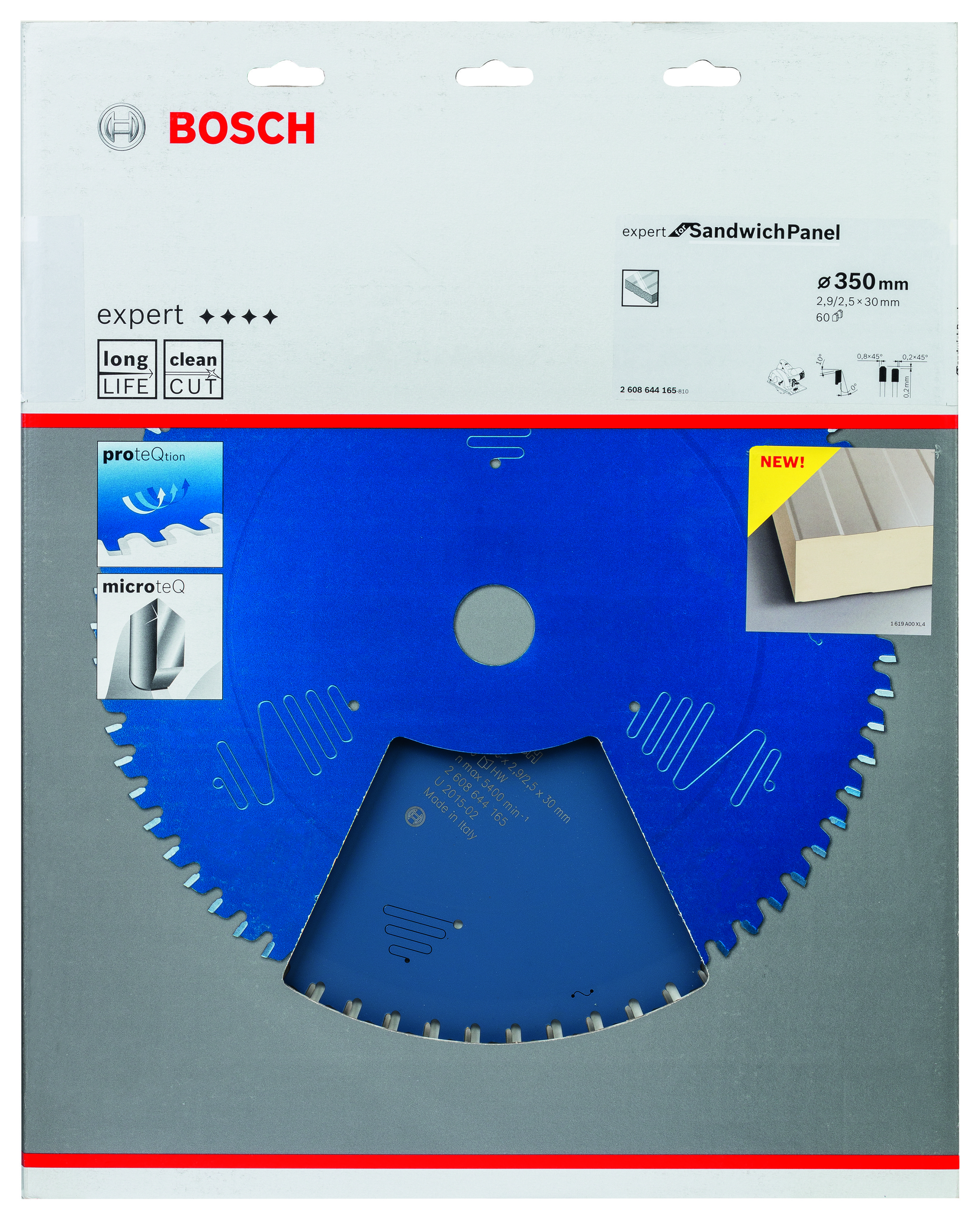 Emballage: 1 Marque: Bosch Référence: 2608644165 EAN: 3165140799539 Description: Lame de Scie Circulaire Expert pour Sandwich Panel, 350 x 30 x 2,9 mm, 60D
