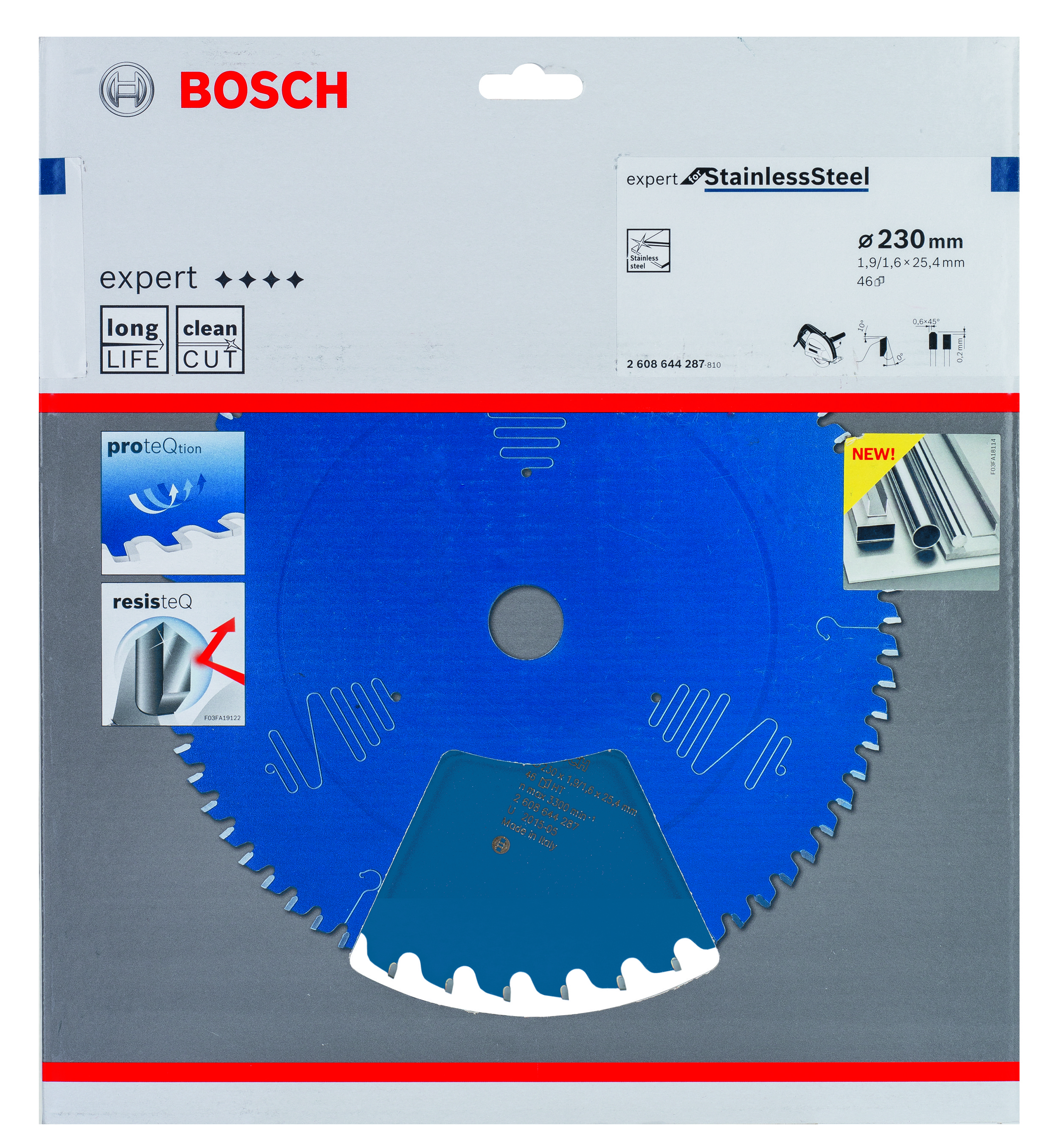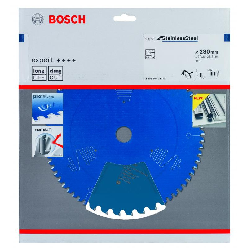 Emballage: 1 Marque: Bosch Référence: 2608644287 EAN: 3165140839938 Description: Lame de Scie Circulaire Expert pour Stainless Steel, 230 x 25,4 x 1,9 mm, 46D