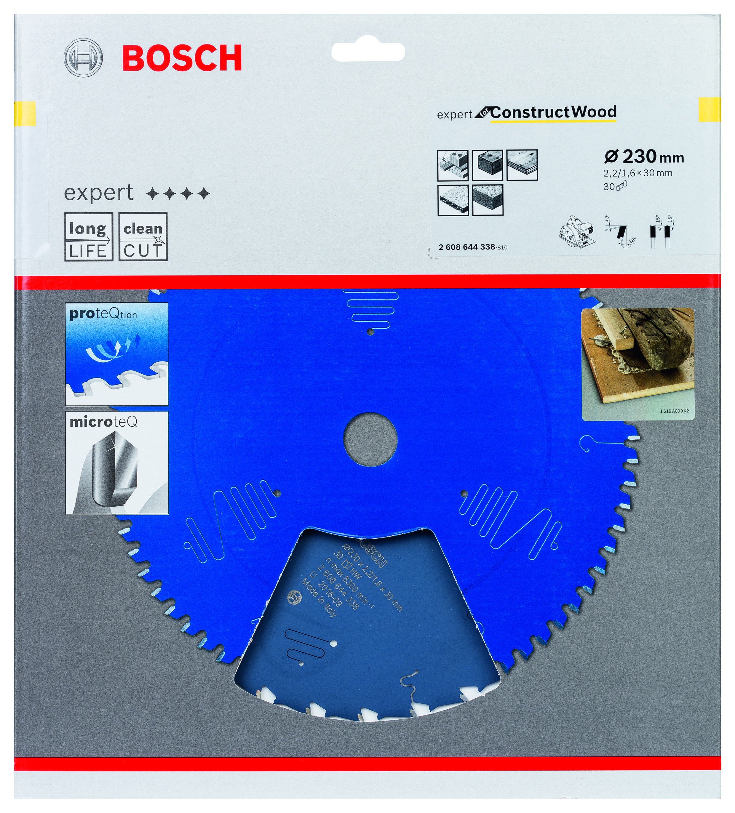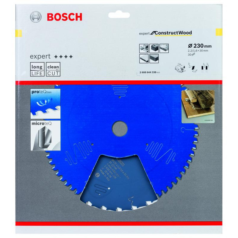 Emballage: 1 Marque: Bosch Référence: 2608644338 EAN: 3165140880886 Description: Lame de Scie Circulaire Expert pour Construct Wood, 230 x 30 x 2,5 mm, 30D