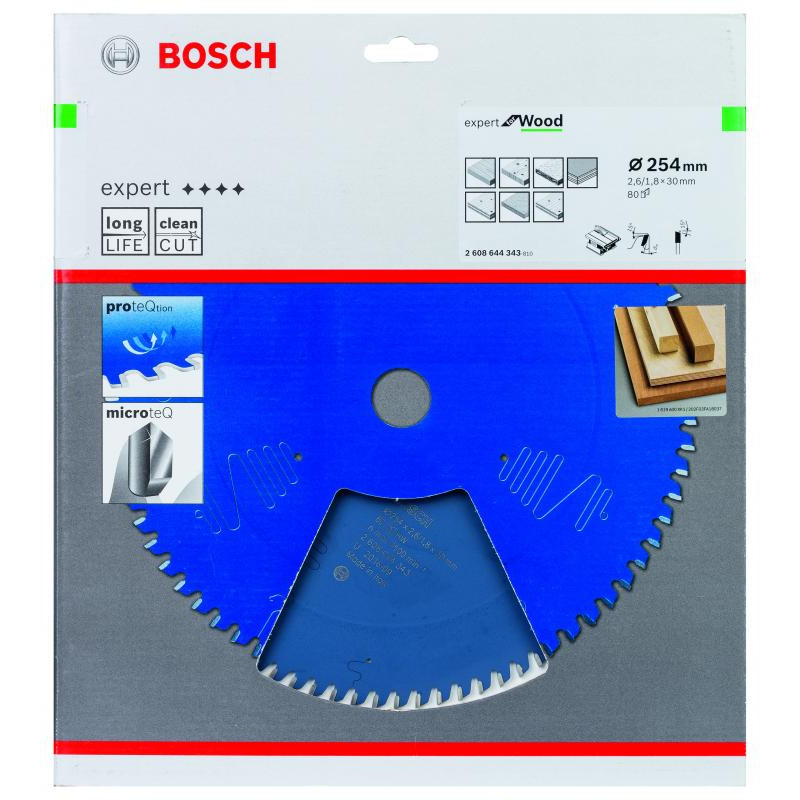 Emballage: 1Marque: BoschRéférence: 2608644343EAN: 3165140880930Description: Lame de Scie Circulaire Expert pour Wood, 254 x 30 x 2,6 mm, 80D