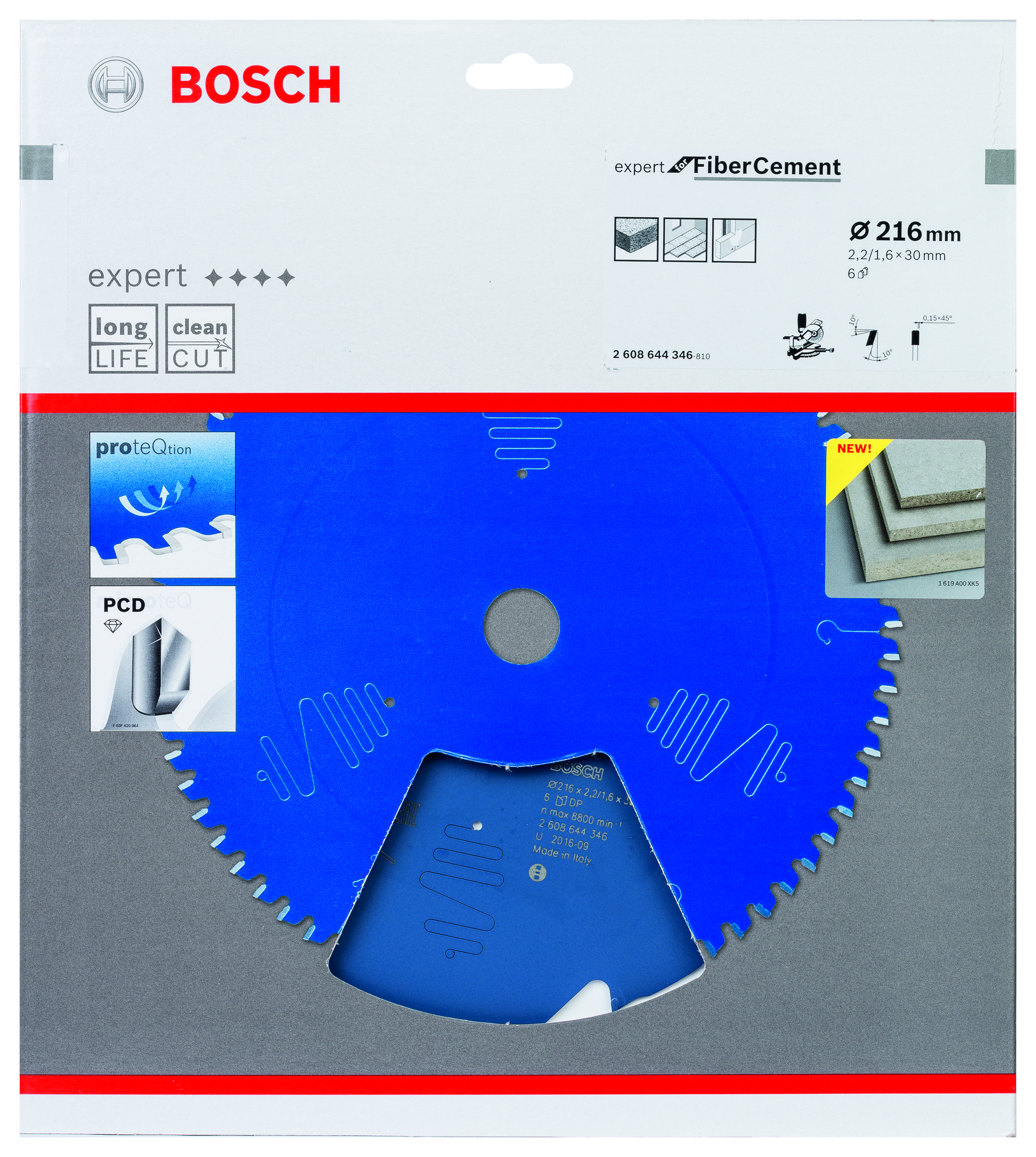 Emballage: 1 Marque: Bosch Référence: 2608644346 EAN: 3165140880961 Description: Lame de Scie Circulaire Expert pour Fire Cement, 216 x 30 x 2,2 mm, 6D