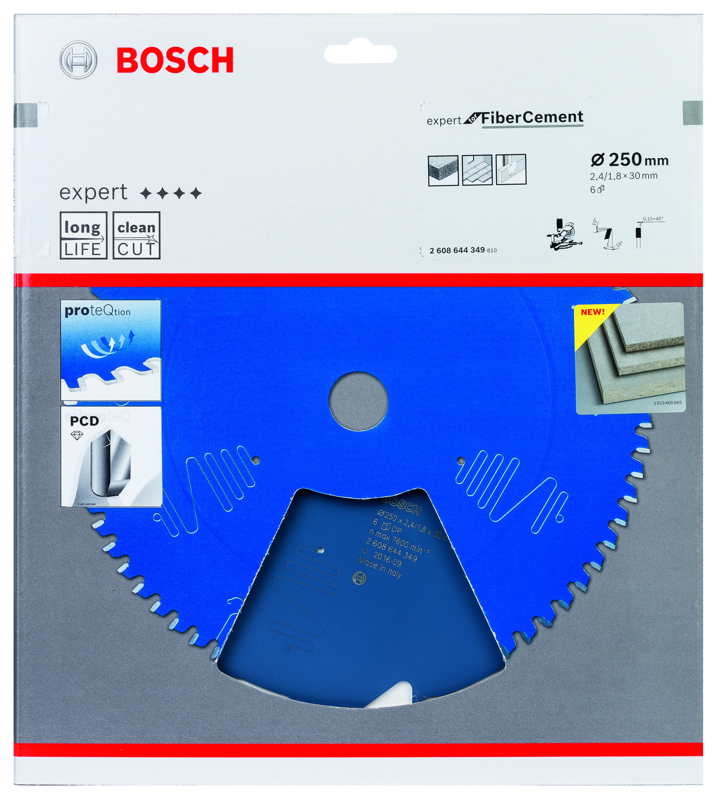 Emballage: 1 Marque: Bosch Référence: 2608644349 EAN: 3165140880992 Description: Lame de Scie Circulaire Expert pour Fire Cement, 250 x 30 x 2,4 mm, 6D