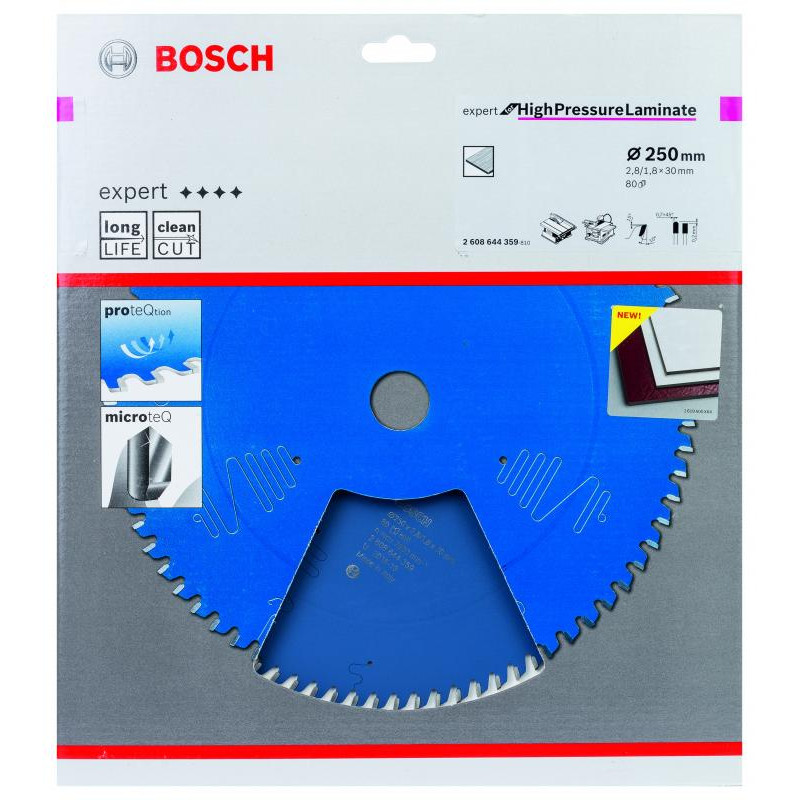 Emballage: 1Marque: BoschRéférence: 2608644359EAN: 3165140881098Description: Lame de Scie Circulaire Expert pour HPL, 250 x 30 x 2,8 mm, 80D