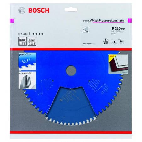 Emballage: 1Marque: BoschRéférence: 2608644361EAN: 3165140881111Description: Lame de Scie Circulaire Expert pour HPL, 260 x 30 x 2,8 mm, 80D