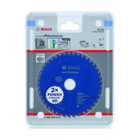 Emballage: 1Marque: BoschRéférence: 2608644534EAN: 3165140957649Description: Lame pour scie circulaire ACCU Expert for Aluminium 120x20x1.8/1.2x42T