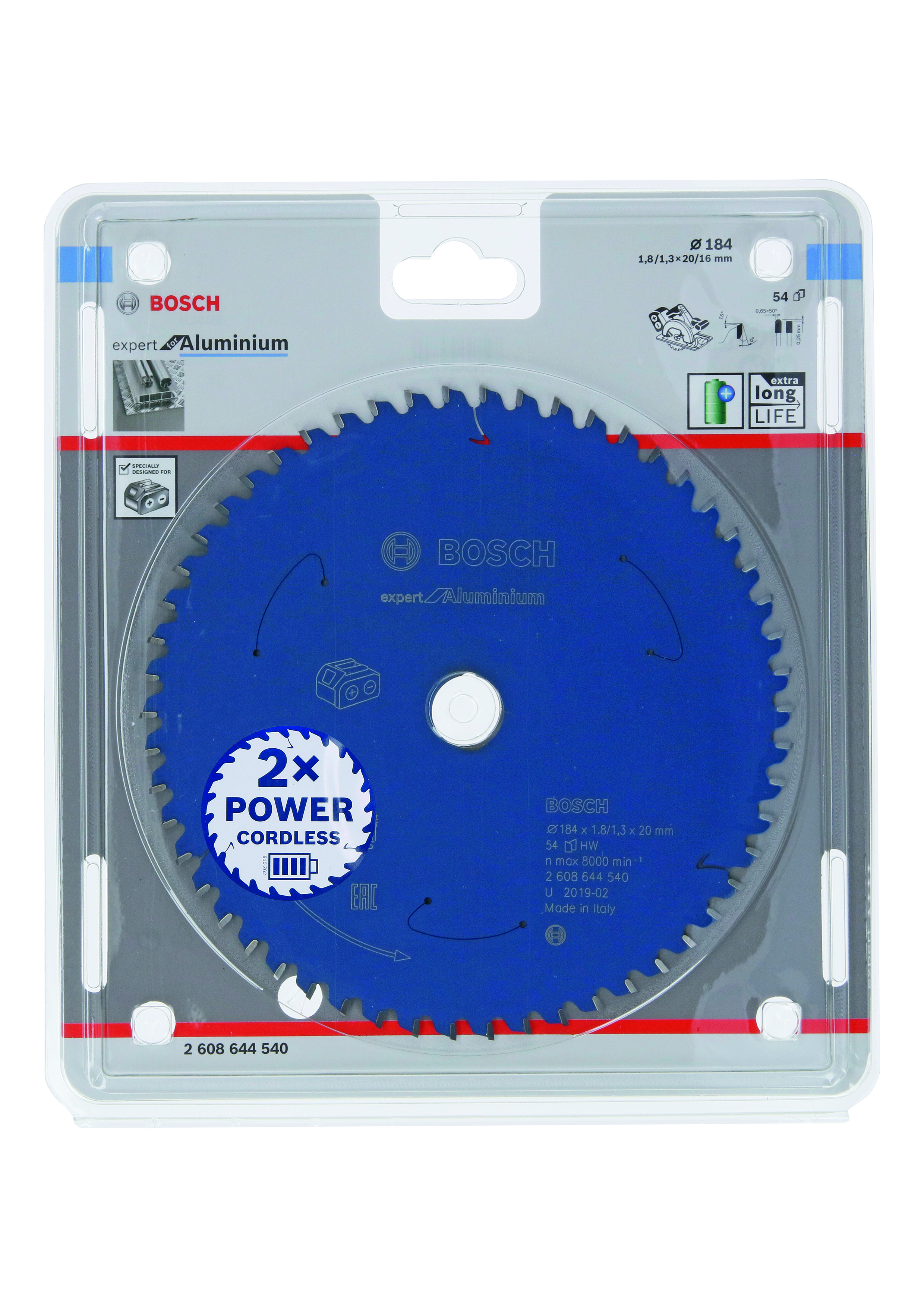 Emballage: 1Marque: BoschRéférence: 2608644540EAN: 3165140957700Description: Lame pour scie circulaire ACCU Expert for Aluminium 184x20x1.8/1.3x54T