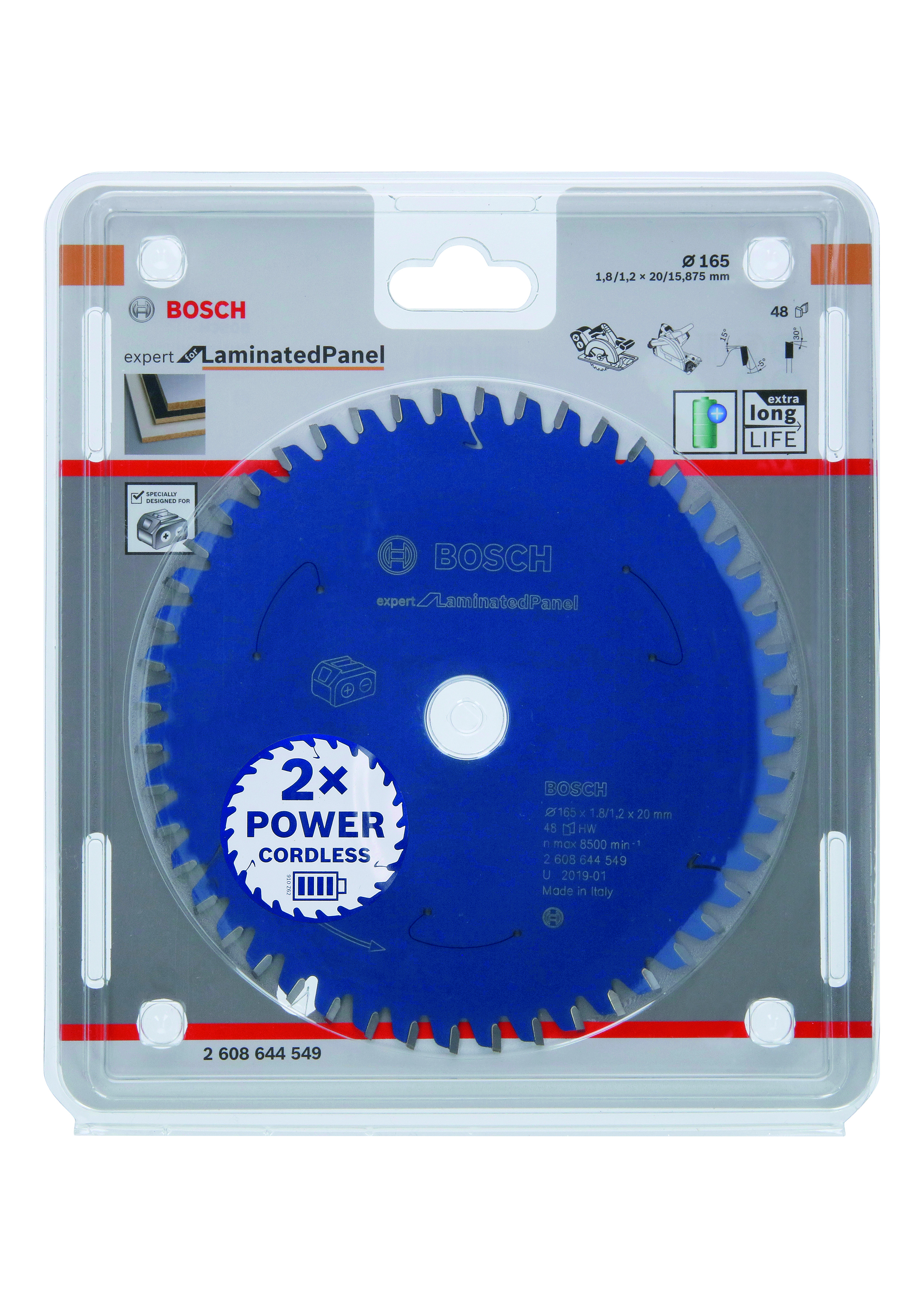 Emballage: 1Marque: BoschRéférence: 2608644549EAN: 3165140957793Description: Lame pour scie circulaire ACCU Expert for Laminated Panel 165x20x1.8/1.2x48T