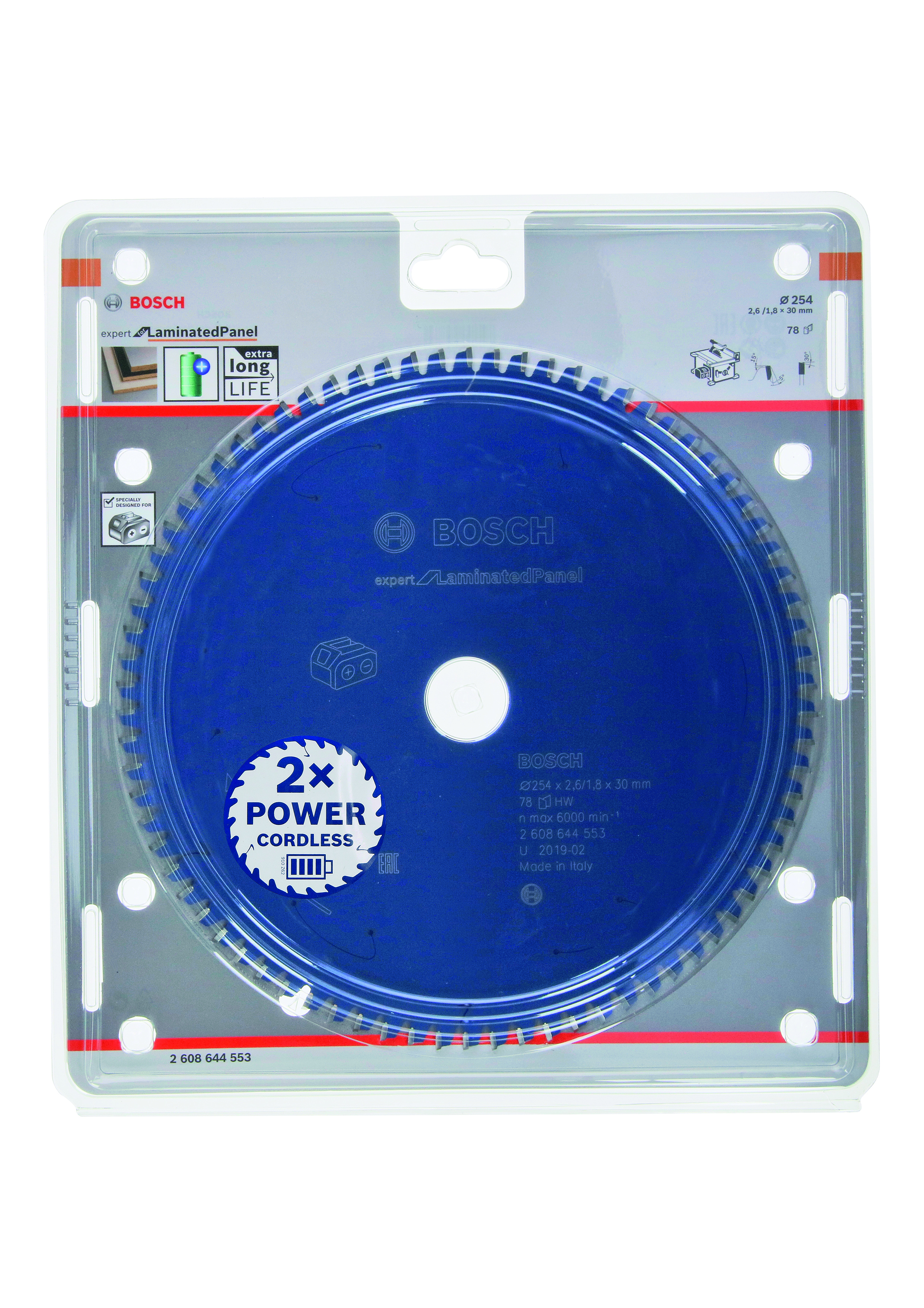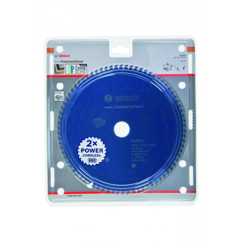 Emballage: 1Marque: BoschRéférence: 2608644553EAN: 3165140957830Description: Lame pour scie circulaire ACCU Expert for Laminated Panel 254x30x2.6/1.8x78T