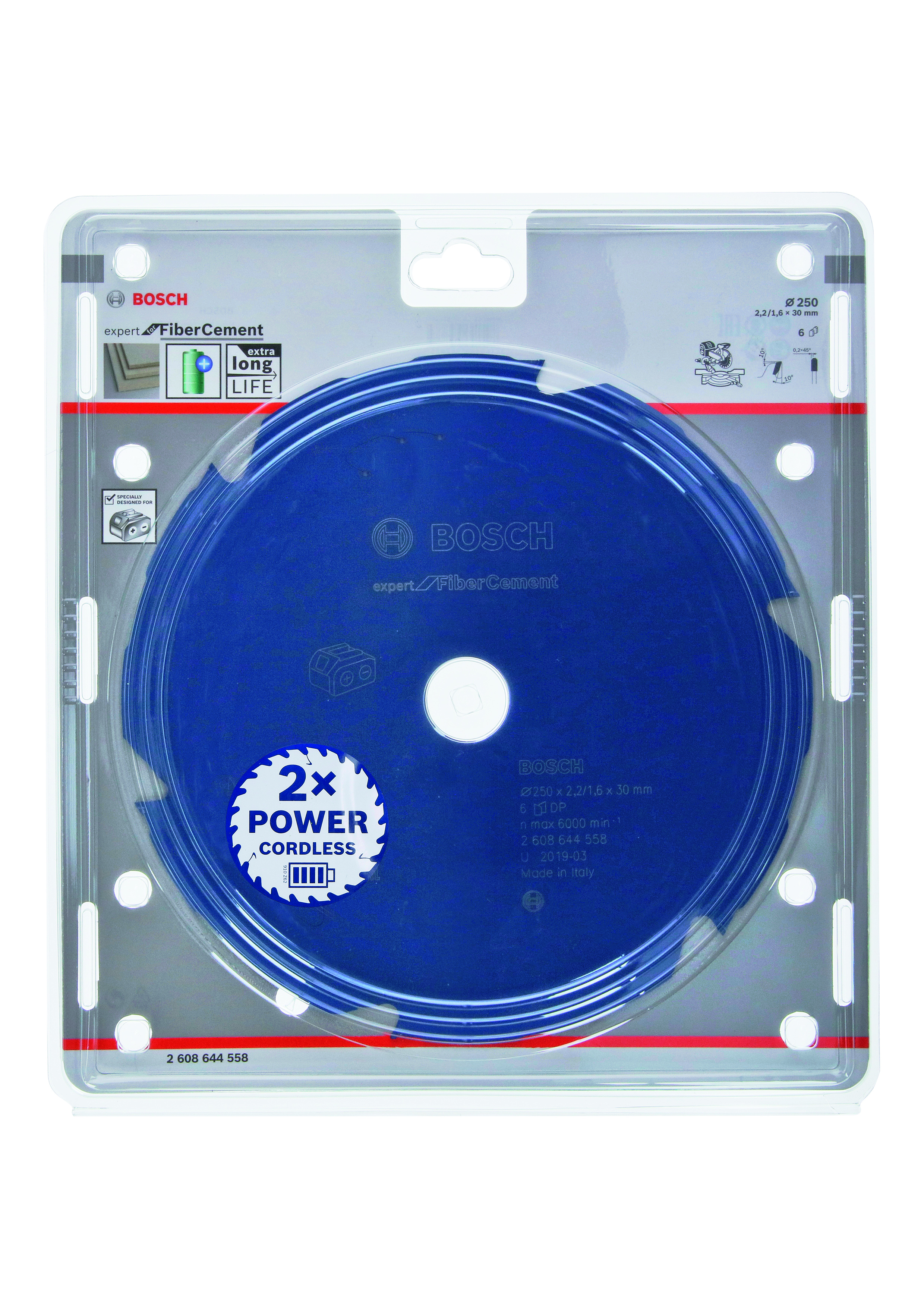 Emballage: 1Marque: BoschRéférence: 2608644558EAN: 3165140957885Description: Lame pour scie circulaire ACCU Expert for Fiber Cement 250x30x2.2/1.6x6T