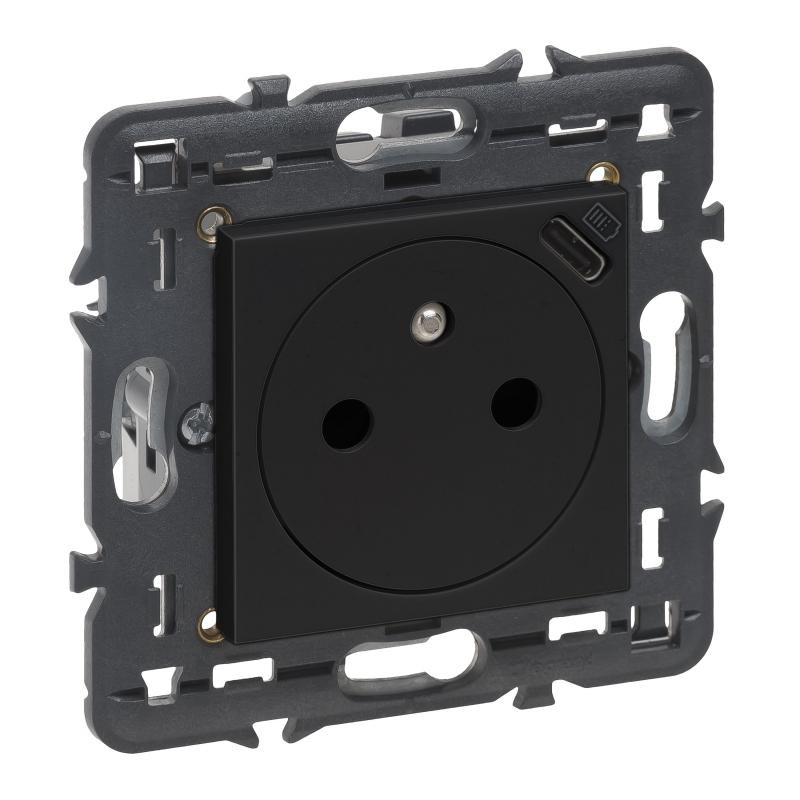 Description: Valena Next prise 2P+T + chargeur USB 1100mA intégré appareil complet noir à griffes