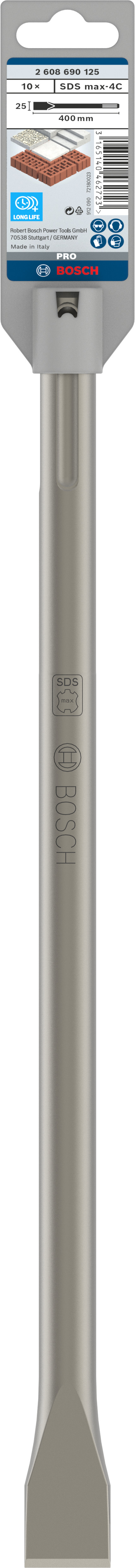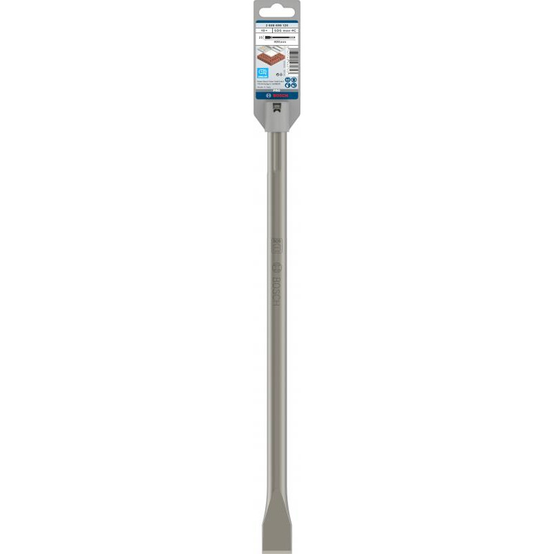 Emballage: 10Marque: BoschRéférence: 2608690125EAN: 3165140462723Description: 10 burins plats PRO SDS max-4C 25x400 mm