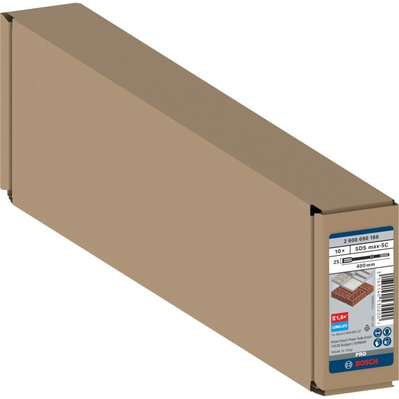 Emballage: 10Marque: BoschRéférence: 2608690166EAN: 3165140530200Description: 10 burins plats PRO SDS max-5C 25x400 mm