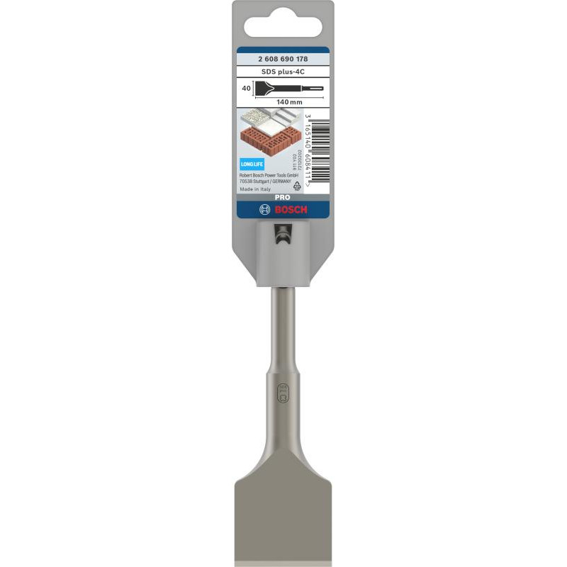 Emballage: 1Marque: BoschRéférence: 2608690178EAN: 3165140608411Description: Burin bêche PRO SDS plus-4C 40x140 mm