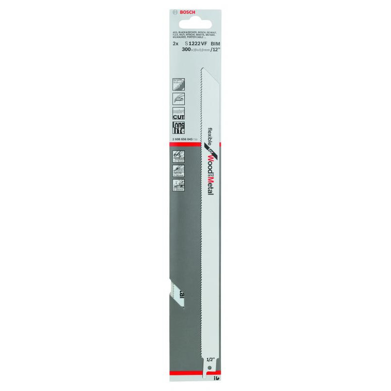 Emballage: 2Marque: BoschRéférence: 2608656043EAN: 3165140093453Description: Lame de Scie Sabre S 1222 VF Flexible for Wood and Metal 2x