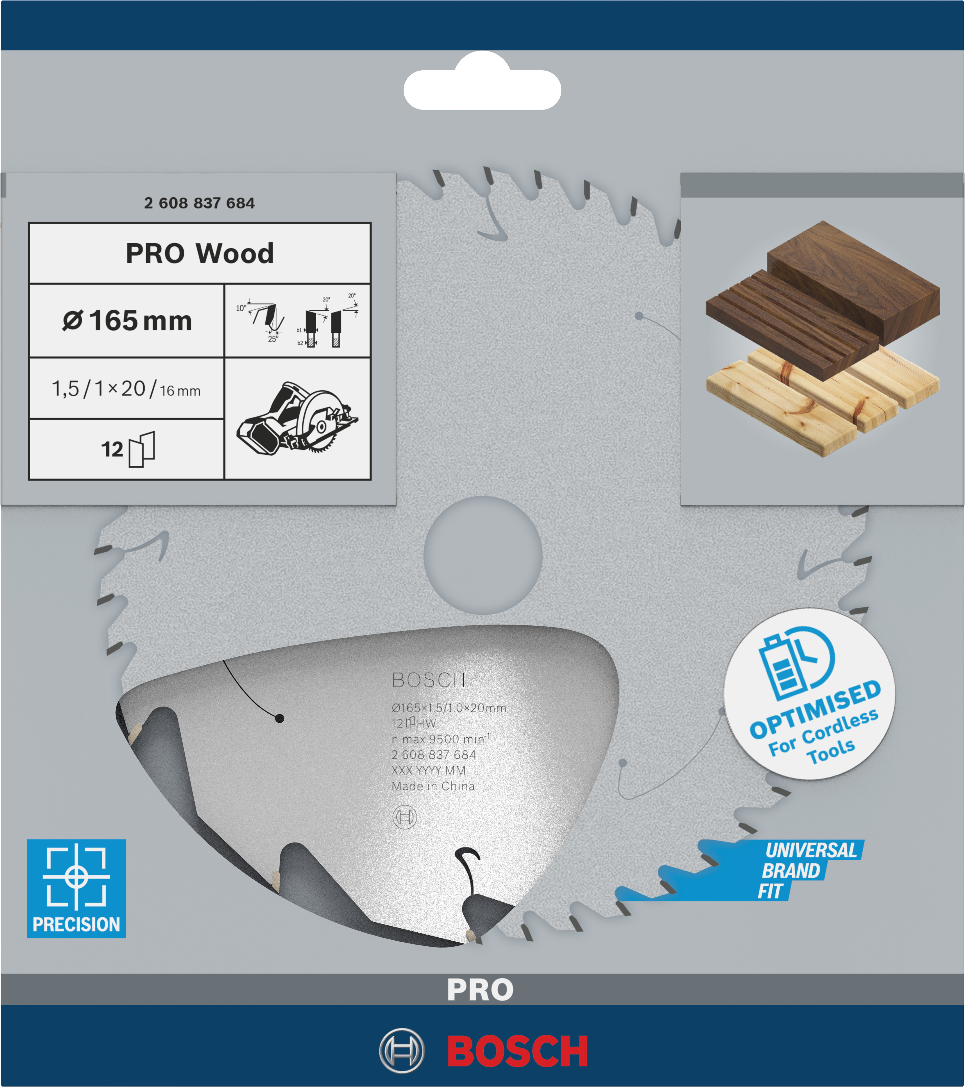 Emballage: 1Marque: BoschRéférence: 2608837684EAN: 3165140958318Description: Lame scie Circulaire Sans-fil PRO Bois 165x20x1,5mm ; 12D