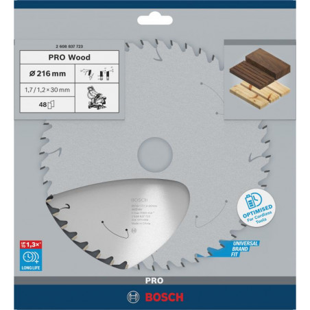 Emballage: 1Marque: BoschRéférence: 2608837723EAN: 3165140958561Description: Lame scie Circulaire à onglets Sans-fil PRO Bois 216x30x1,7mm ; 48D