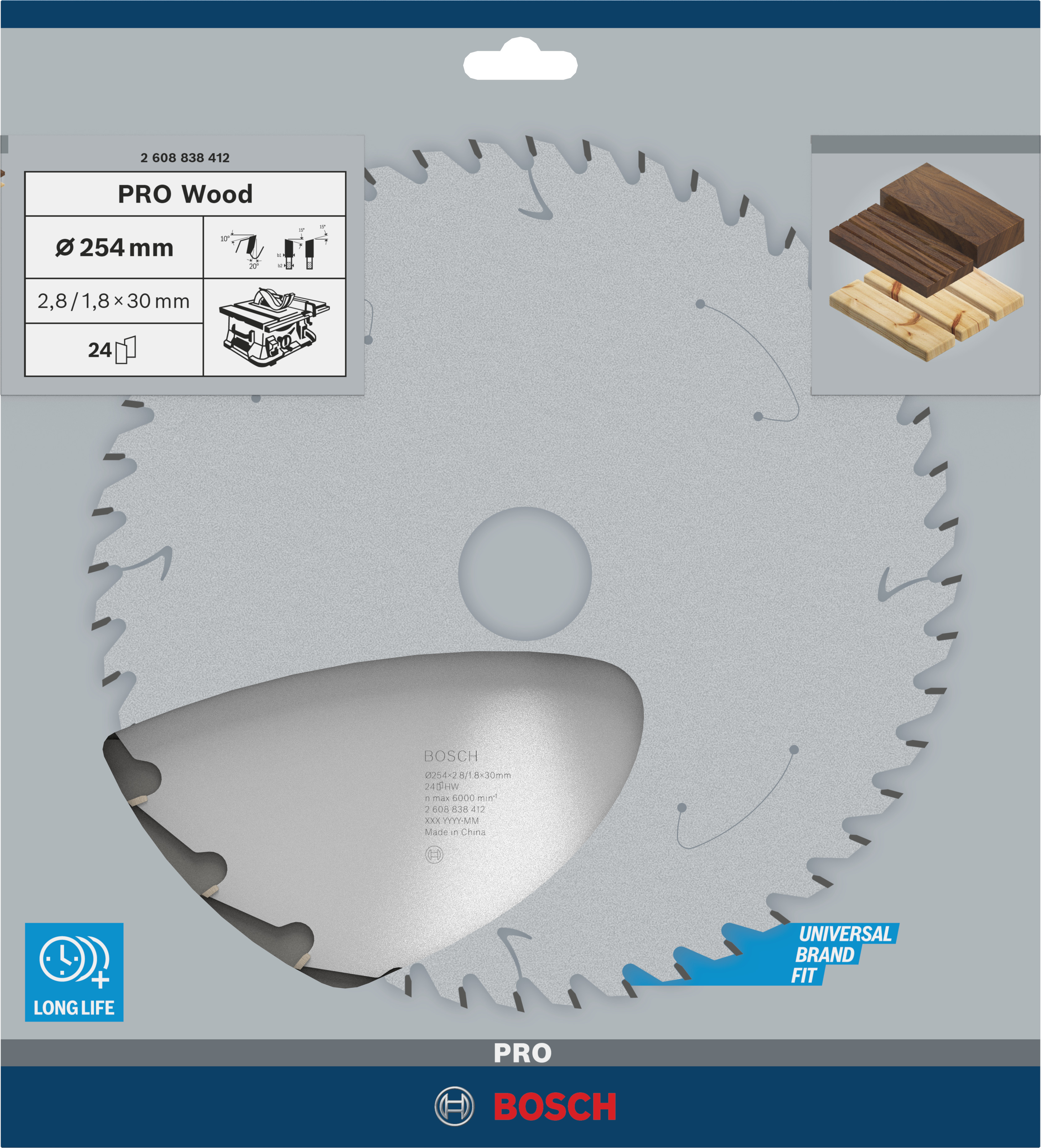Emballage: 1Marque: BoschRéférence: 2608838412EAN: 3165140964630Description: Lame scie Circulaire sur table PRO Bois 254x30x2,8mm ; 24D