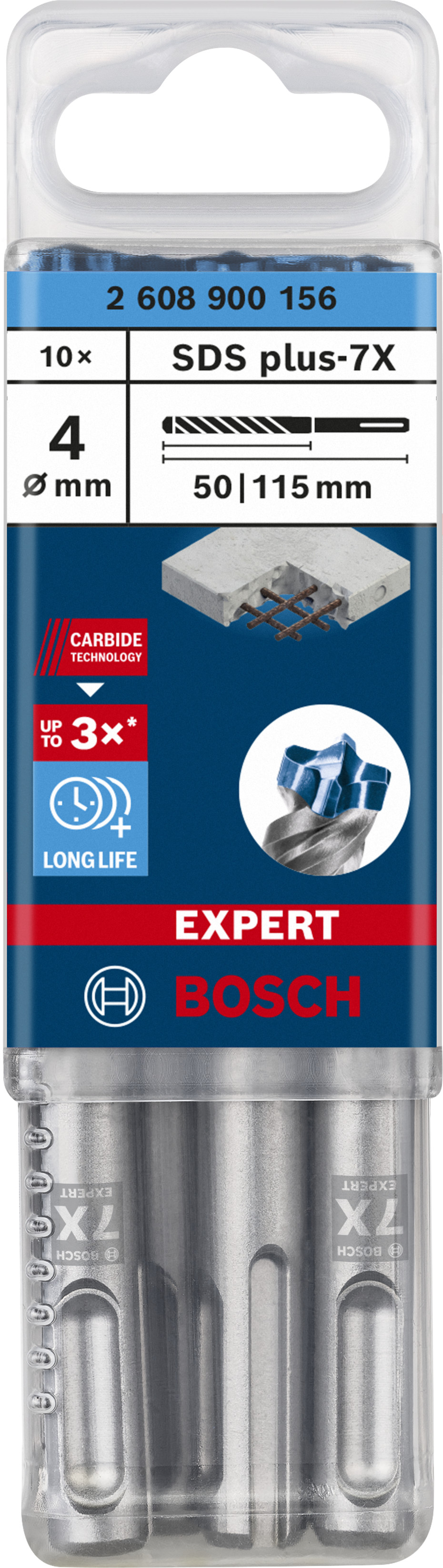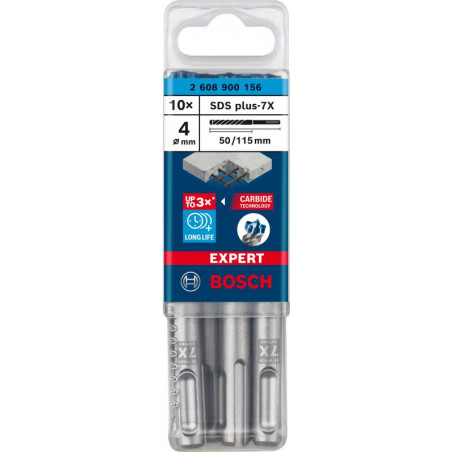 Emballage: 10Marque: BoschRéférence: 2608900156EAN: 4059952532295Description: EXPERT Foret SDS plus-7X 10st 4x50x115mm