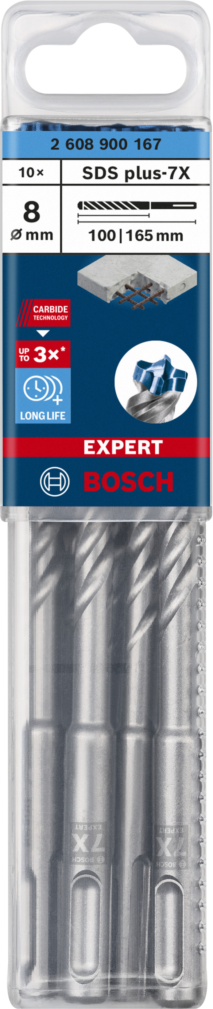 Emballage: 10Marque: BoschRéférence: 2608900167EAN: 4059952532400Description: EXPERT Foret SDS plus-7X 10st 8x100x165mm