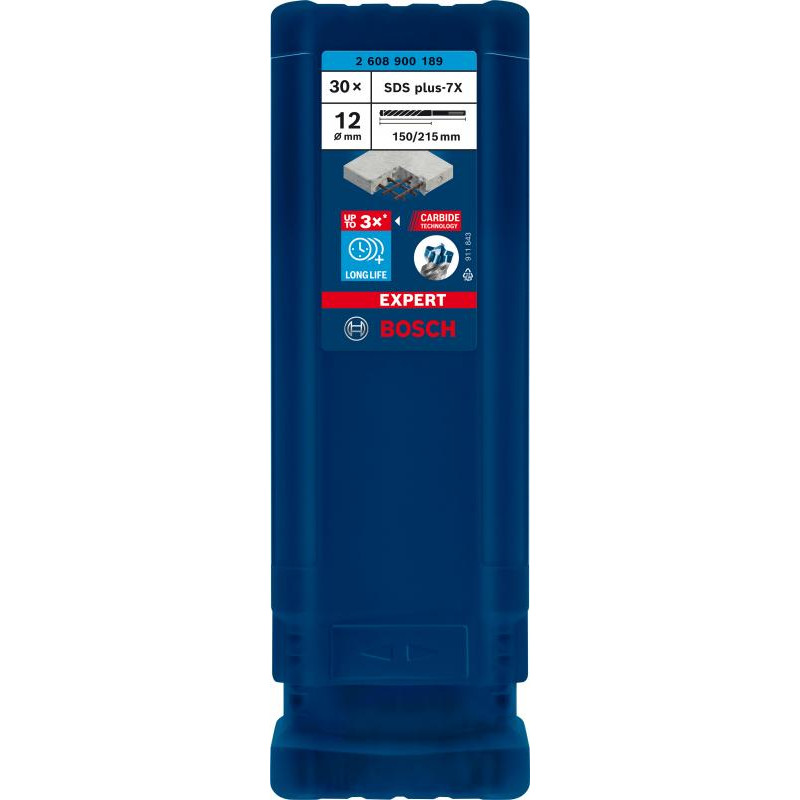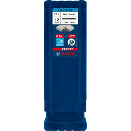 Emballage: 30Marque: BoschRéférence: 2608900189EAN: 4059952532622Description: EXPERT Foret SDS plus-7X 30st 12x150x215mm