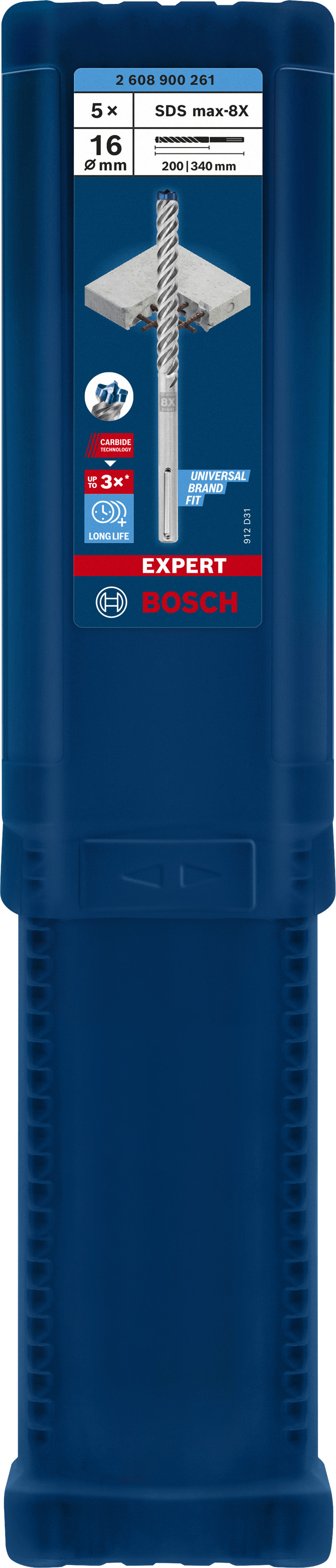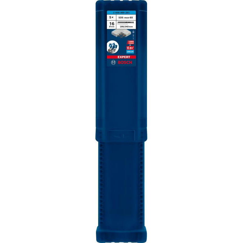 Emballage: 5Marque: BoschRéférence: 2608900261EAN: 4059952533353Description: EXPERT Emballage 5 pcs SDS-max-8X 16 x 200 x 340 mm