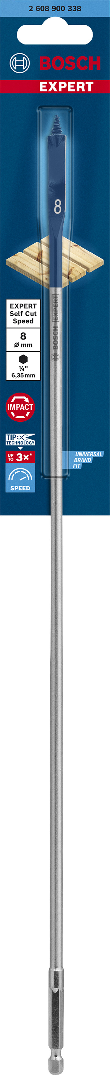 Emballage: 1Marque: BoschRéférence: 2608900338EAN: 4059952534121Description: EXPERT Mèche plate Self Cut Speed, six pans 8 x 400 mm