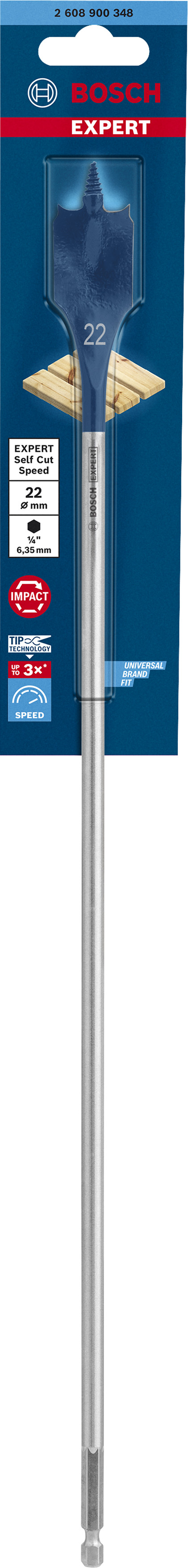 Emballage: 1Marque: BoschRéférence: 2608900348EAN: 4059952534220Description: EXPERT Mèche plate Self Cut Speed, six pans 22 x 400 mm