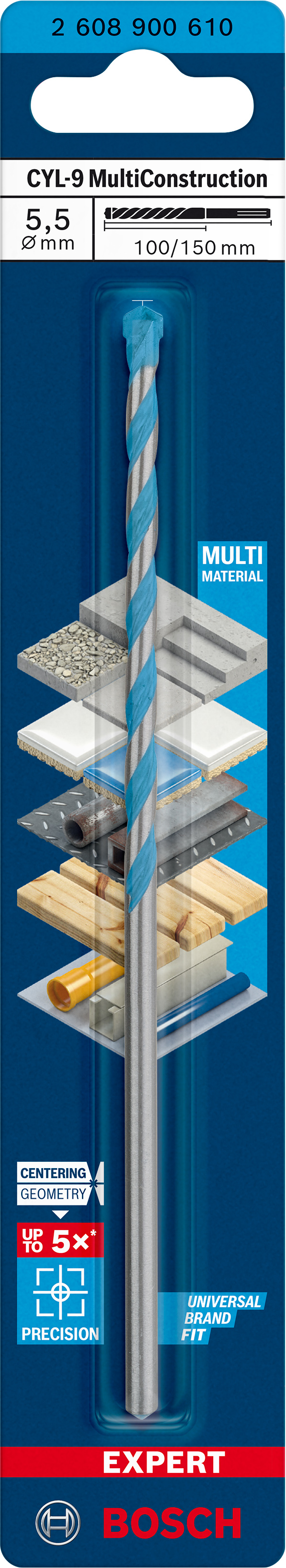 Emballage: 1 Marque: Bosch Référence: 2608900610 EAN: 4059952539034 Description: EXPERT Foret polyvalent CYL-9 Multi Construction, 5,5 x 100 x 150 mm, D4,5 mm