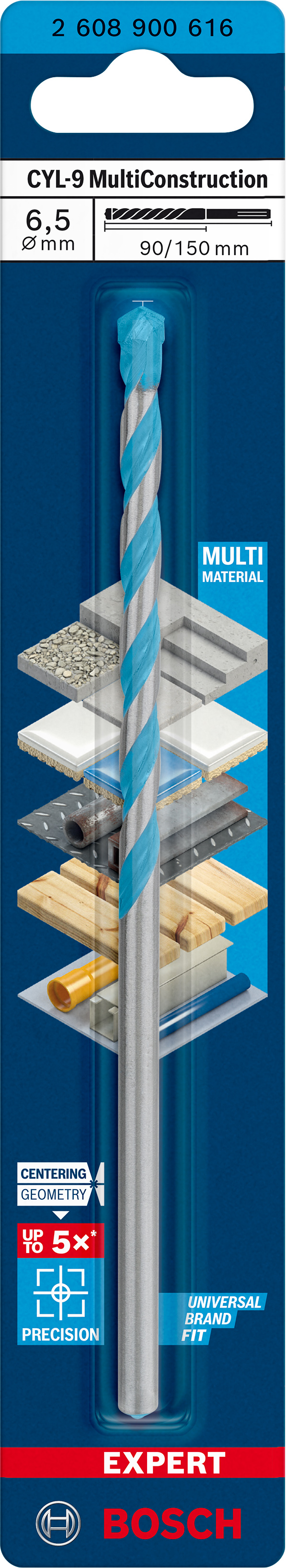 Emballage: 1 Marque: Bosch Référence: 2608900616 EAN: 4059952539096 Description: EXPERT Foret polyvalent CYL-9 Multi Construction, 6,5 x 90 x 150 mm, D5,5 mm