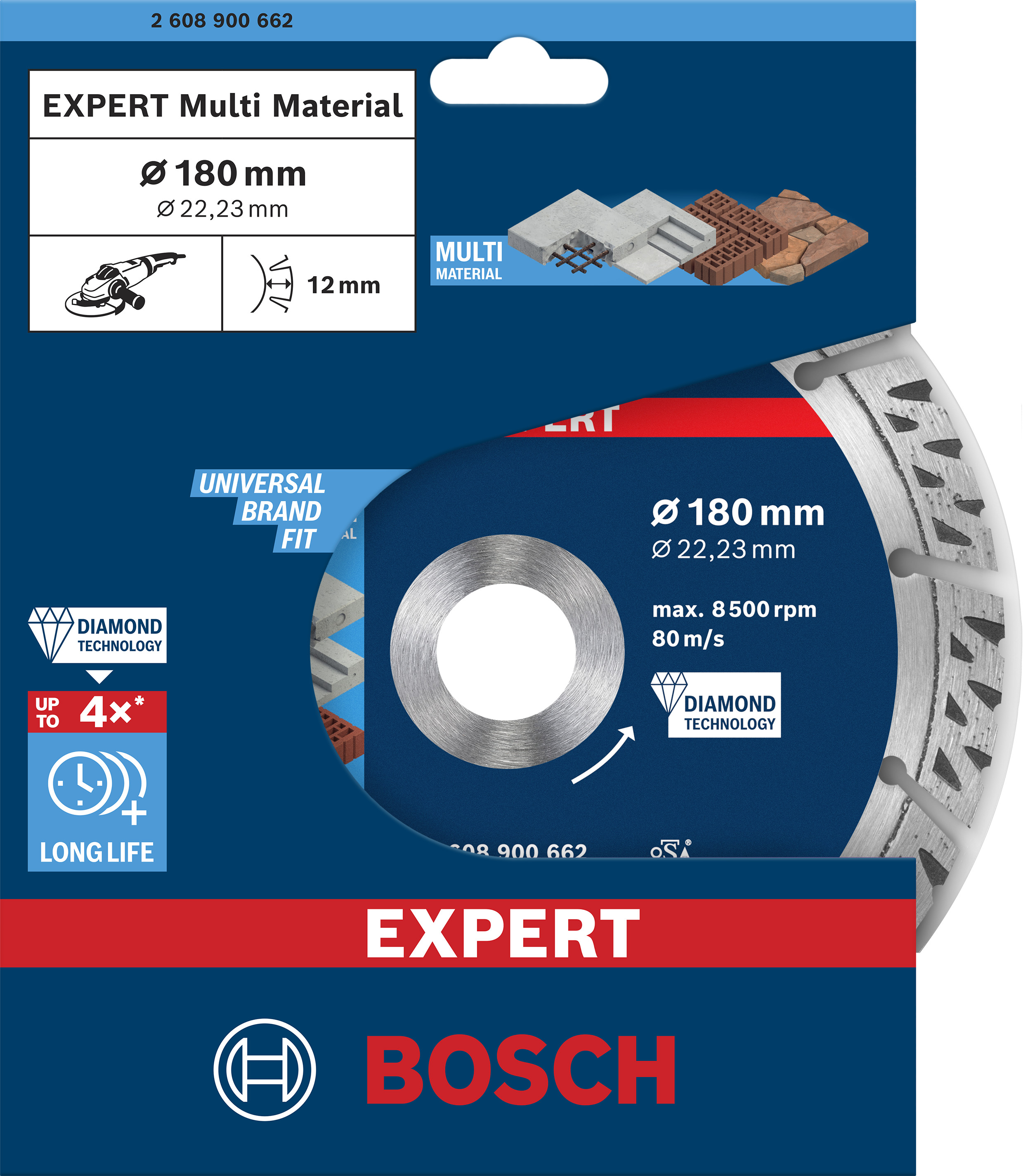 Emballage: 1Marque: BoschRéférence: 2608900662EAN: 4059952539973Description: EXPERT Disque diamanté Multi Material 180 x 22,23 x 2,4 x 12 mm