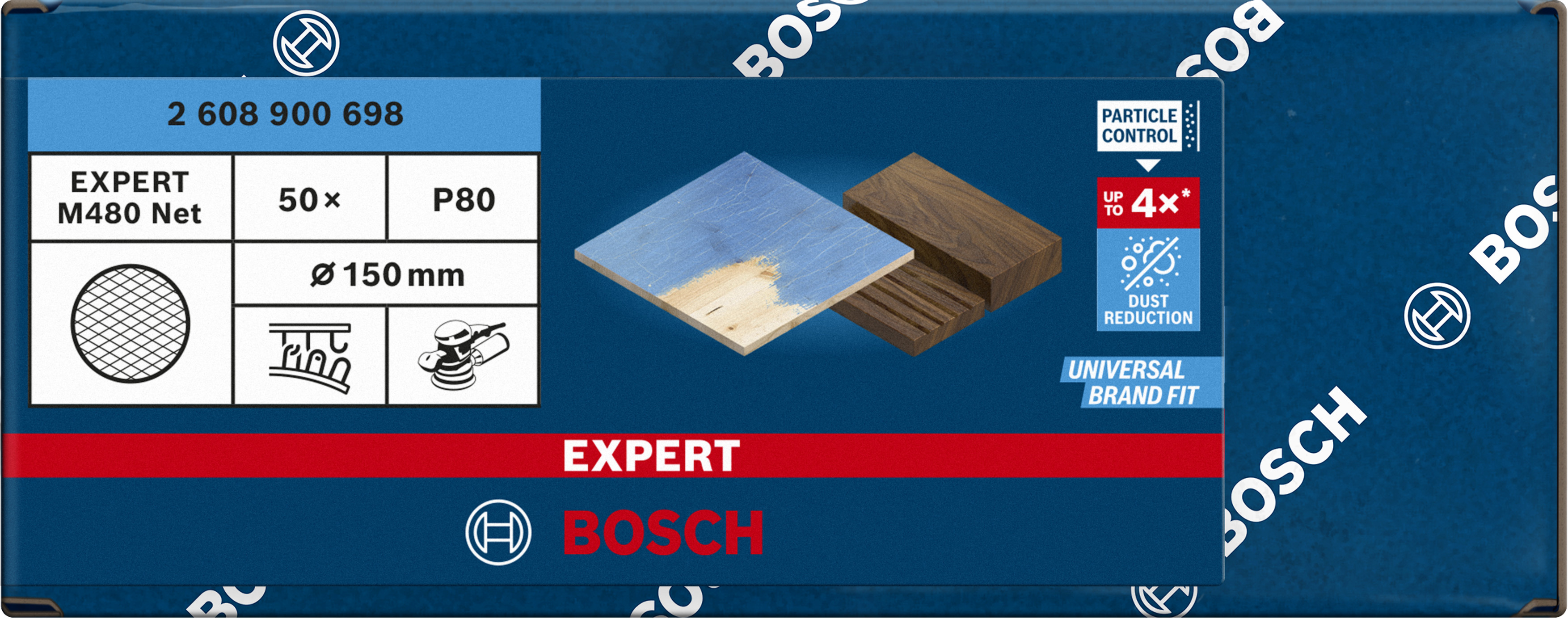 Emballage: 50Marque: BoschRéférence: 2608900698EAN: 4059952540368Description: EXPERT Abrasif M480 Best for Wood and Paint, diamètre 150 mm, grain 80, 50x