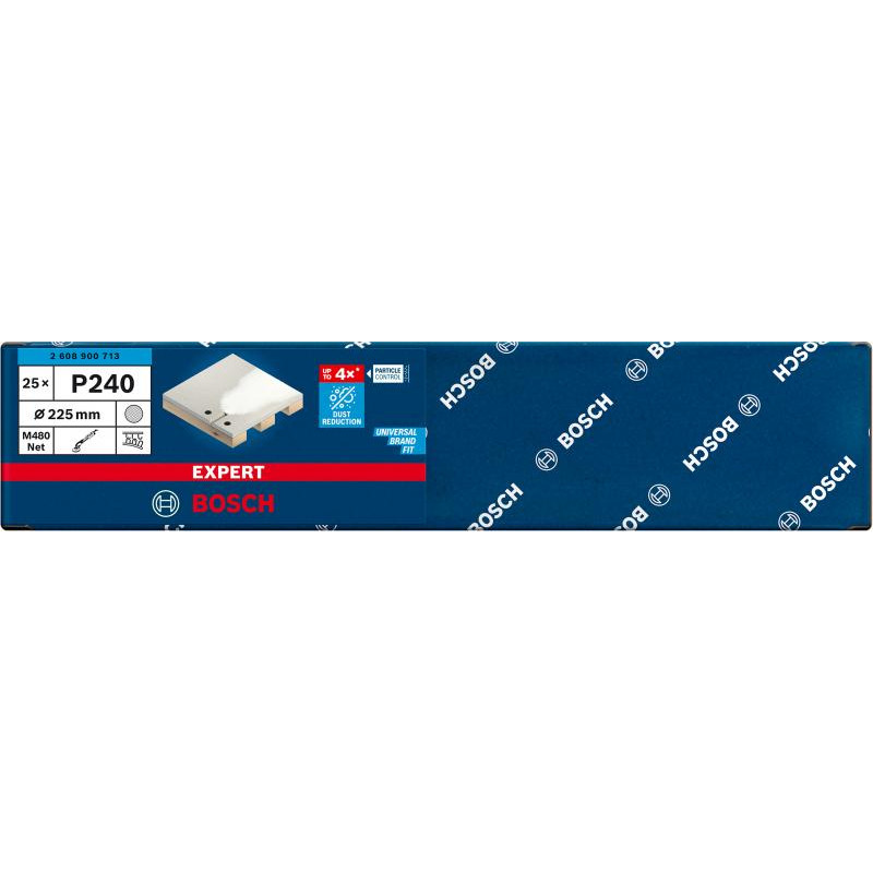 Emballage: 25Marque: BoschRéférence: 2608900713EAN: 4059952540511Description: EXPERT Abrasif M480 Best for Wood and Paint, diamètre 225 mm, grain 240, 25x