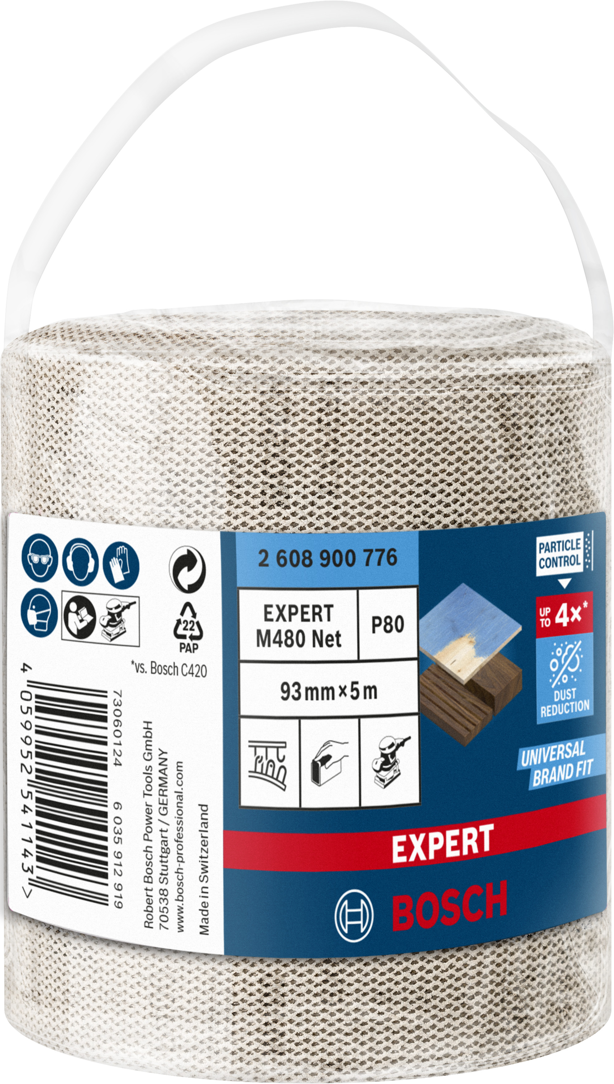 Emballage: 1 Marque: Bosch Référence: 2608900776 EAN: 4059952541143 Description: EXPERT Rouleau Abrasif M480 Best for Wood and Paint, 93 mm x 5 m, grain 80