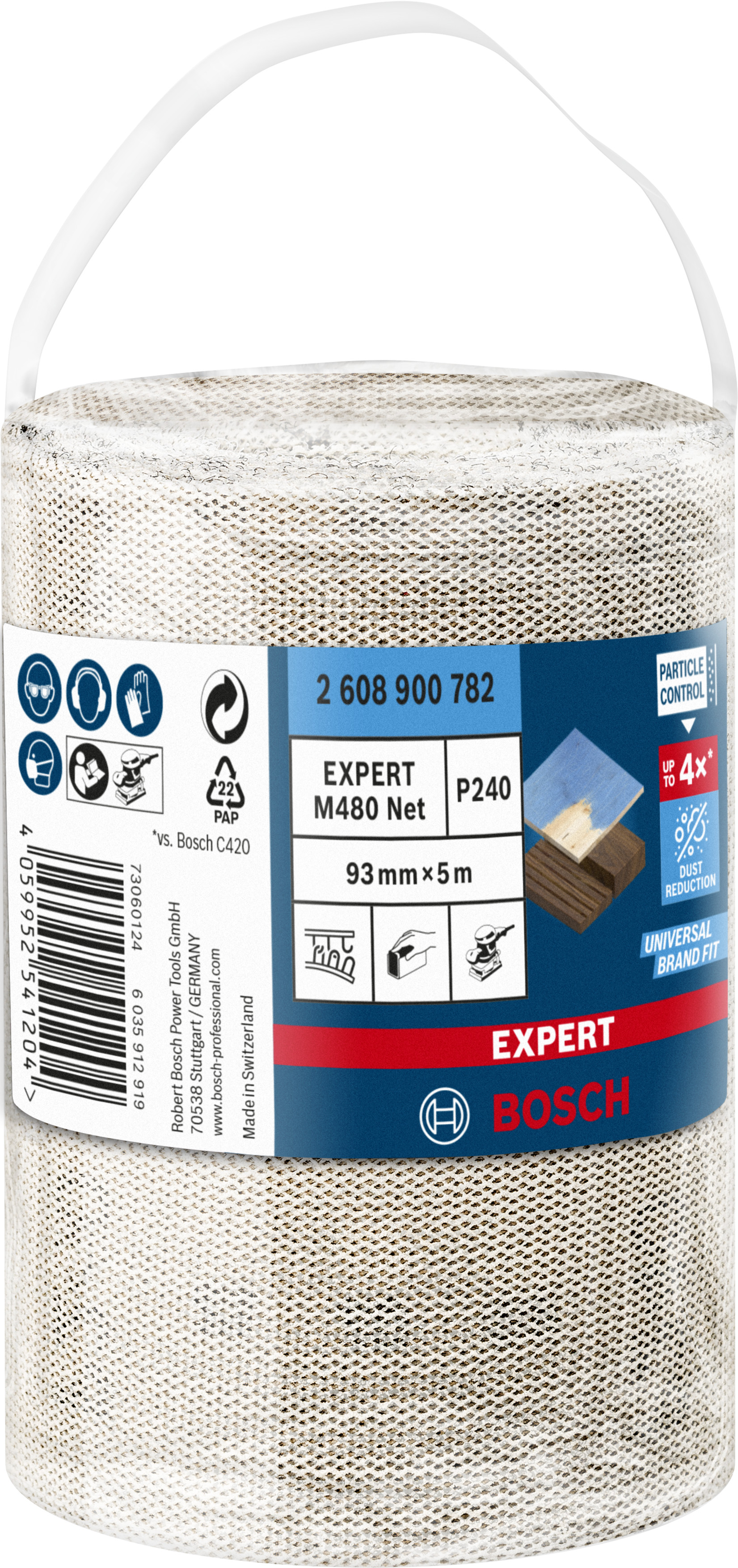 Emballage: 1 Marque: Bosch Référence: 2608900782 EAN: 4059952541204 Description: EXPERT Rouleau Abrasif M480 Best for Wood and Paint, 93 mm x 5 m, grain 240