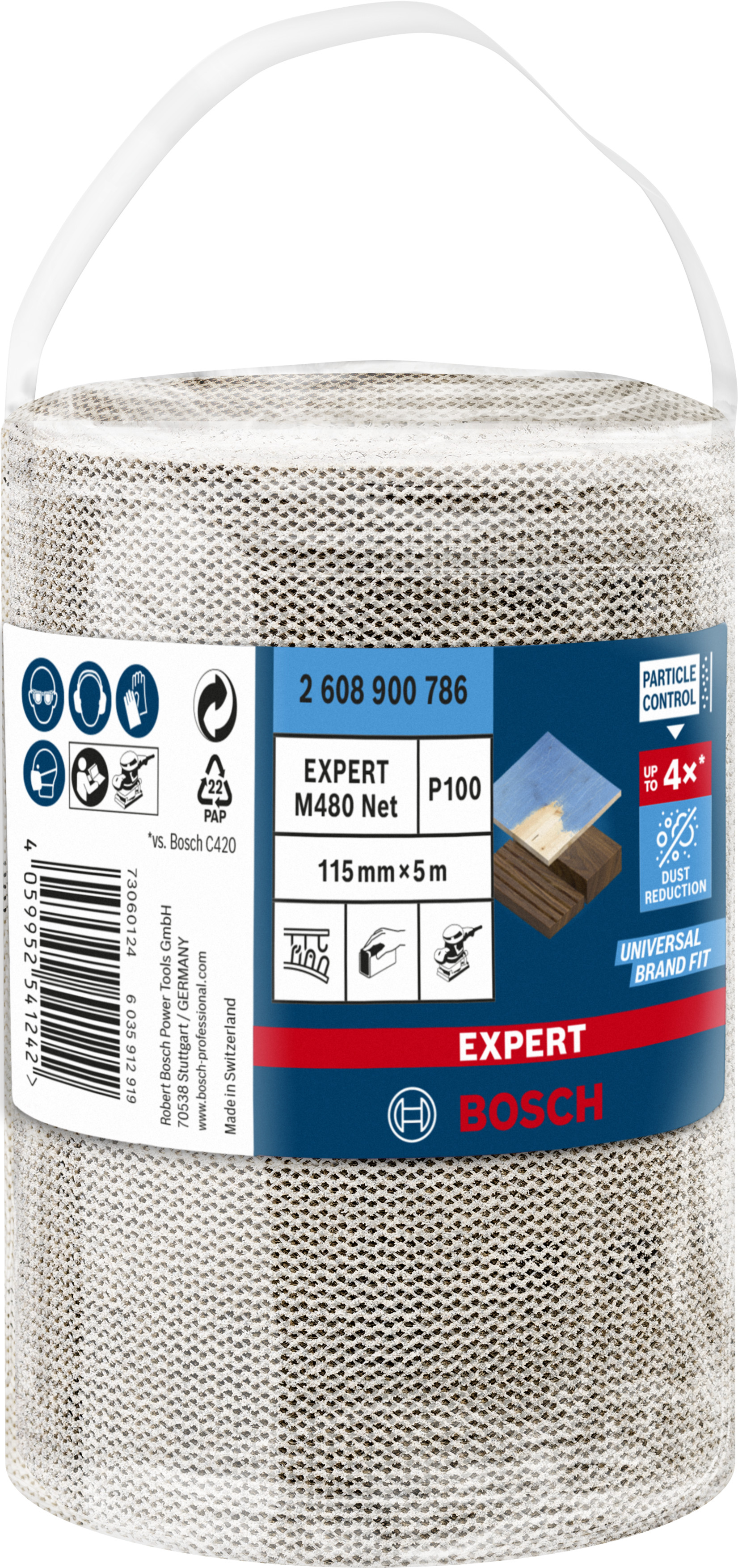 Emballage: 1 Marque: Bosch Référence: 2608900786 EAN: 4059952541242 Description: EXPERT Rouleau Abrasif M480 Best for Wood and Paint, 115 mm x 5 m, grain 100