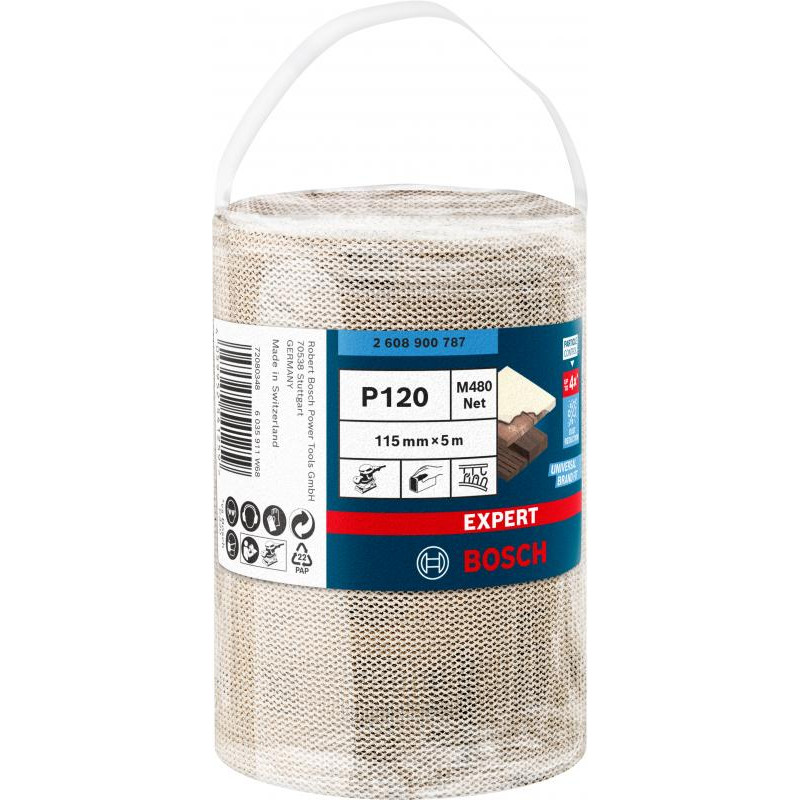 Emballage: 1 Marque: Bosch Référence: 2608900787 EAN: 4059952541259 Description: EXPERT Rouleau Abrasif M480 Best for Wood and Paint, 115 mm x 5 m, grain 120