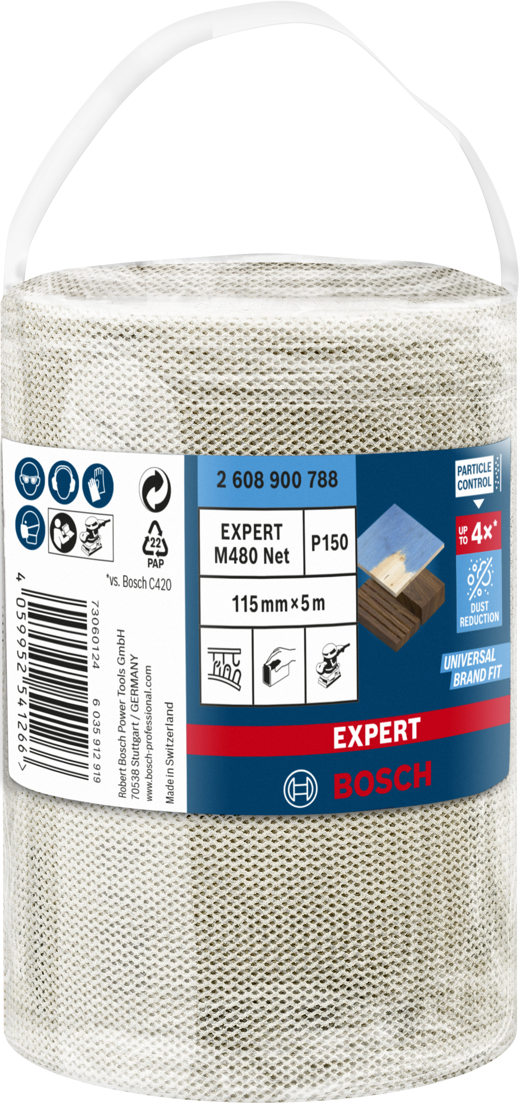 Emballage: 1 Marque: Bosch Référence: 2608900788 EAN: 4059952541266 Description: EXPERT Rouleau Abrasif M480 Best for Wood and Paint, 115 mm x 5 m, grain 150