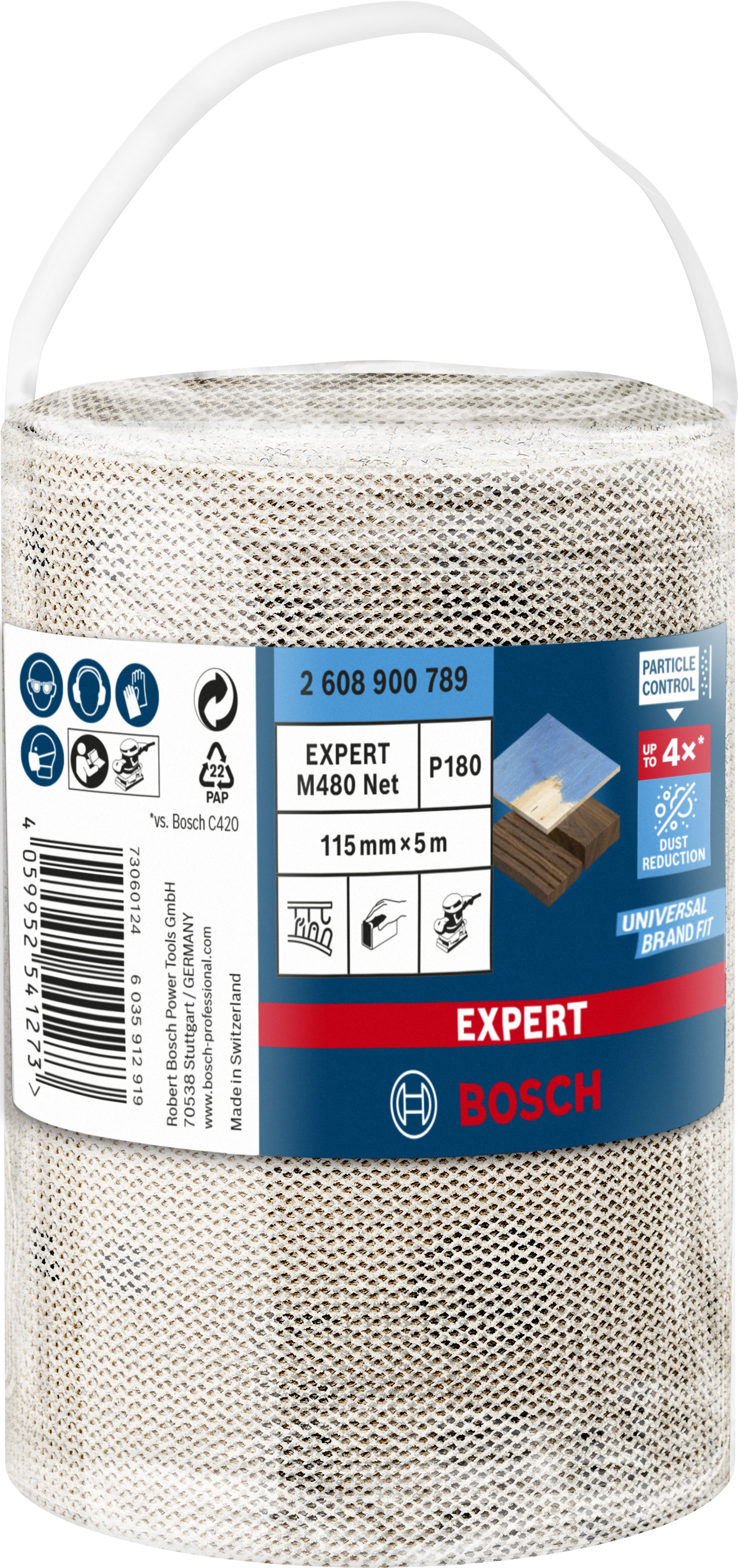 Emballage: 1 Marque: Bosch Référence: 2608900789 EAN: 4059952541273 Description: EXPERT Rouleau Abrasif M480 Best for Wood and Paint, 115 mm x 5 m, grain 180