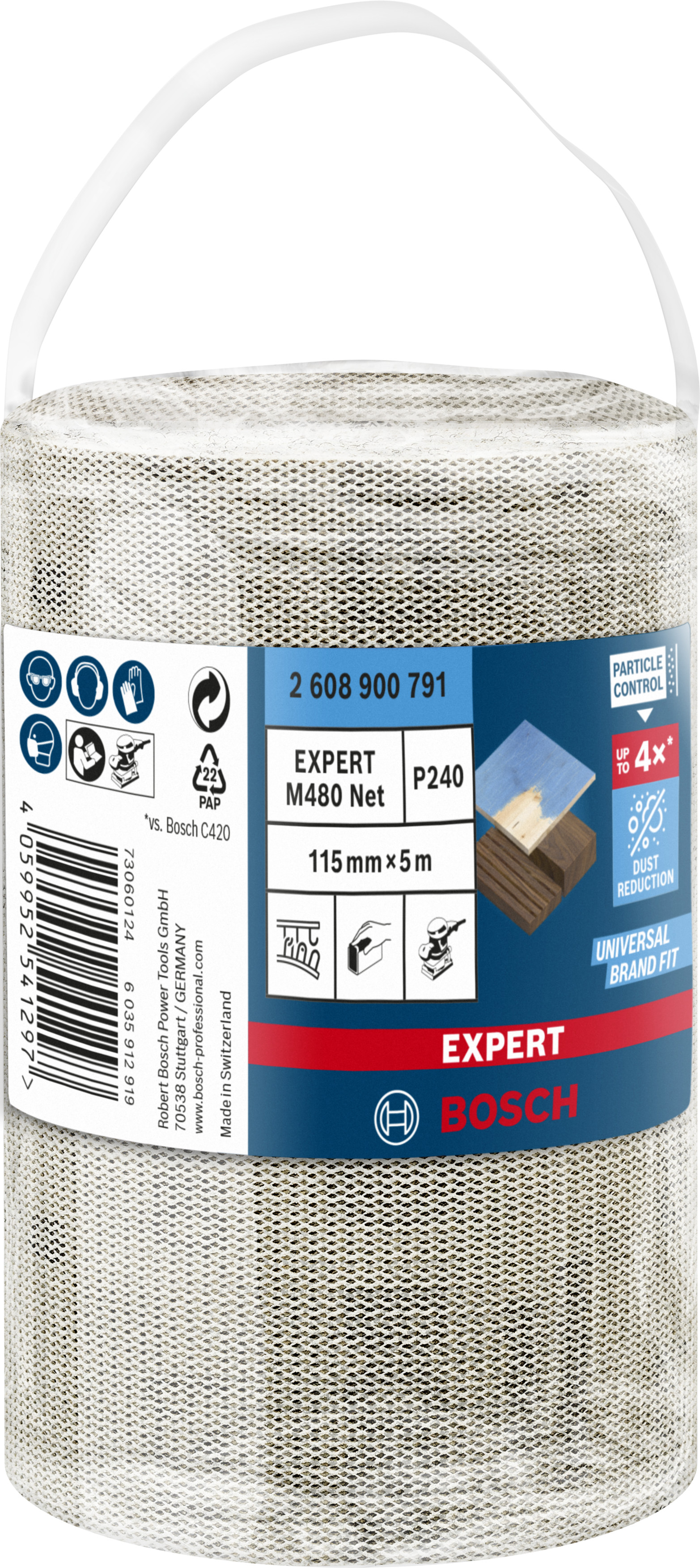 Emballage: 1 Marque: Bosch Référence: 2608900791 EAN: 4059952541297 Description: EXPERT Rouleau Abrasif M480 Best for Wood and Paint, 115 mm x 5 m, grain 240