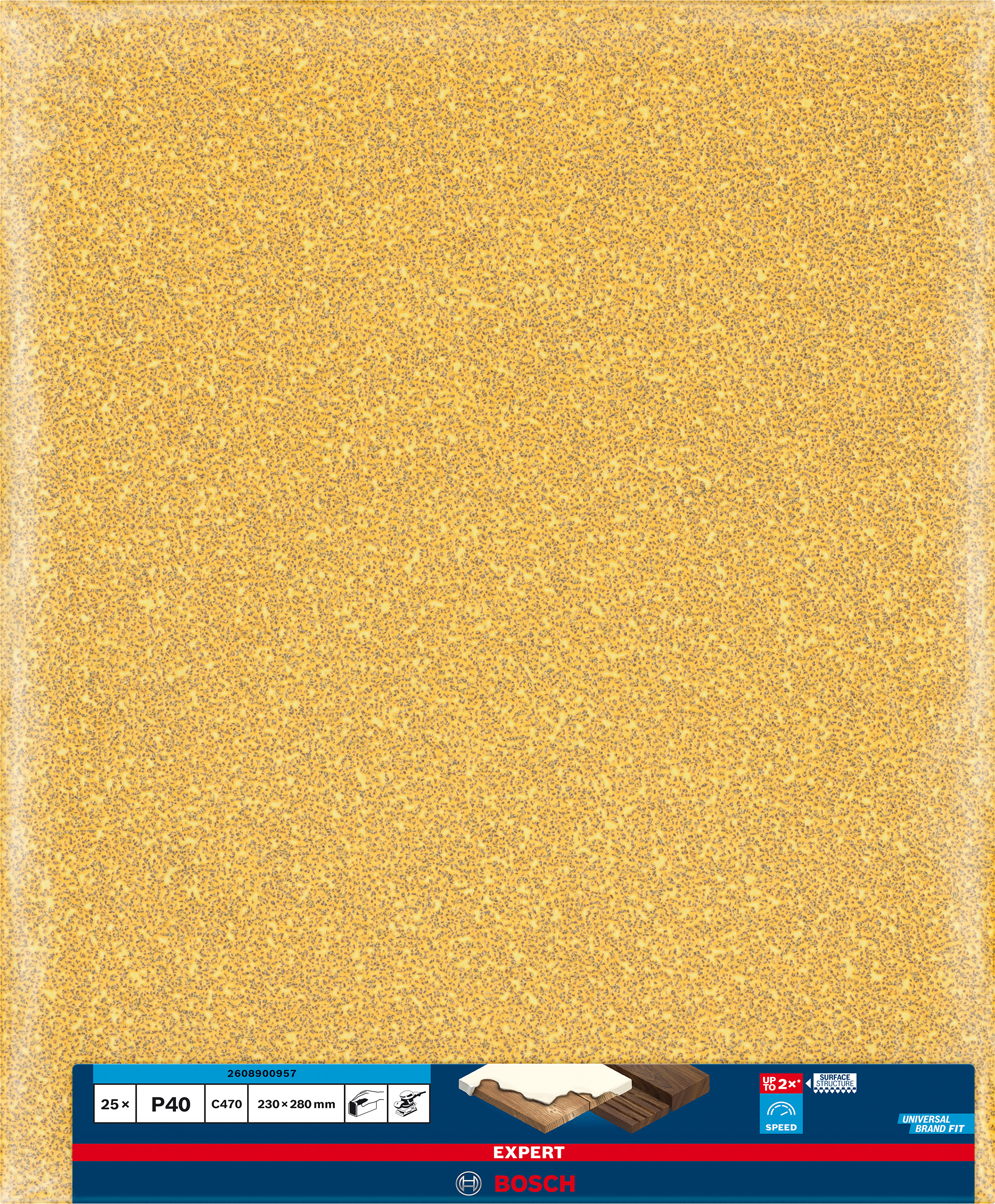 Emballage: 1Marque: BoschRéférence: 2608900957EAN: 4059952542959Description: EXPERT Abrasif C470 Best for Wood and Paint, 230 x 280 mm, grain 40