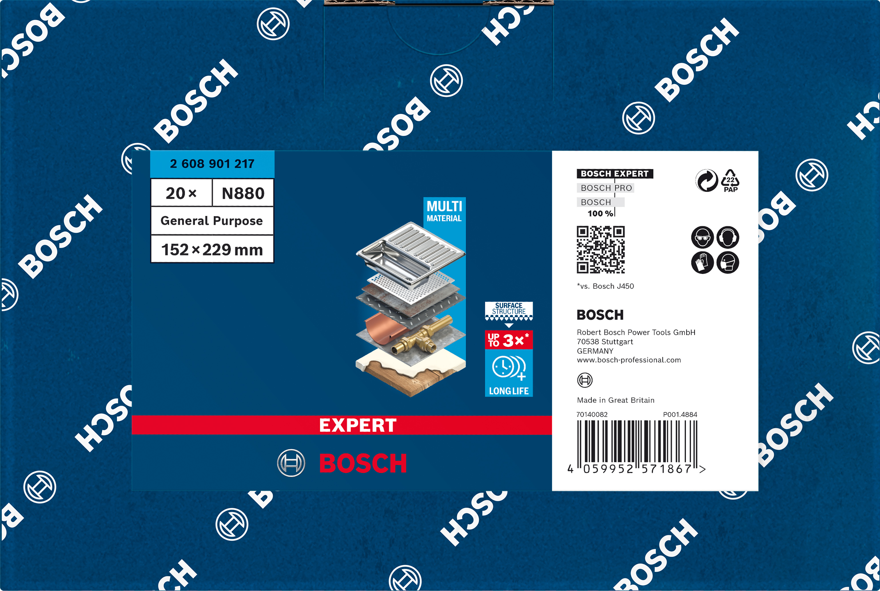Emballage: 1Marque: BoschRéférence: 2608901217EAN: 4059952571867Description: EXPERT Abrasif non tissé 152x229, Exp Finish, très fin