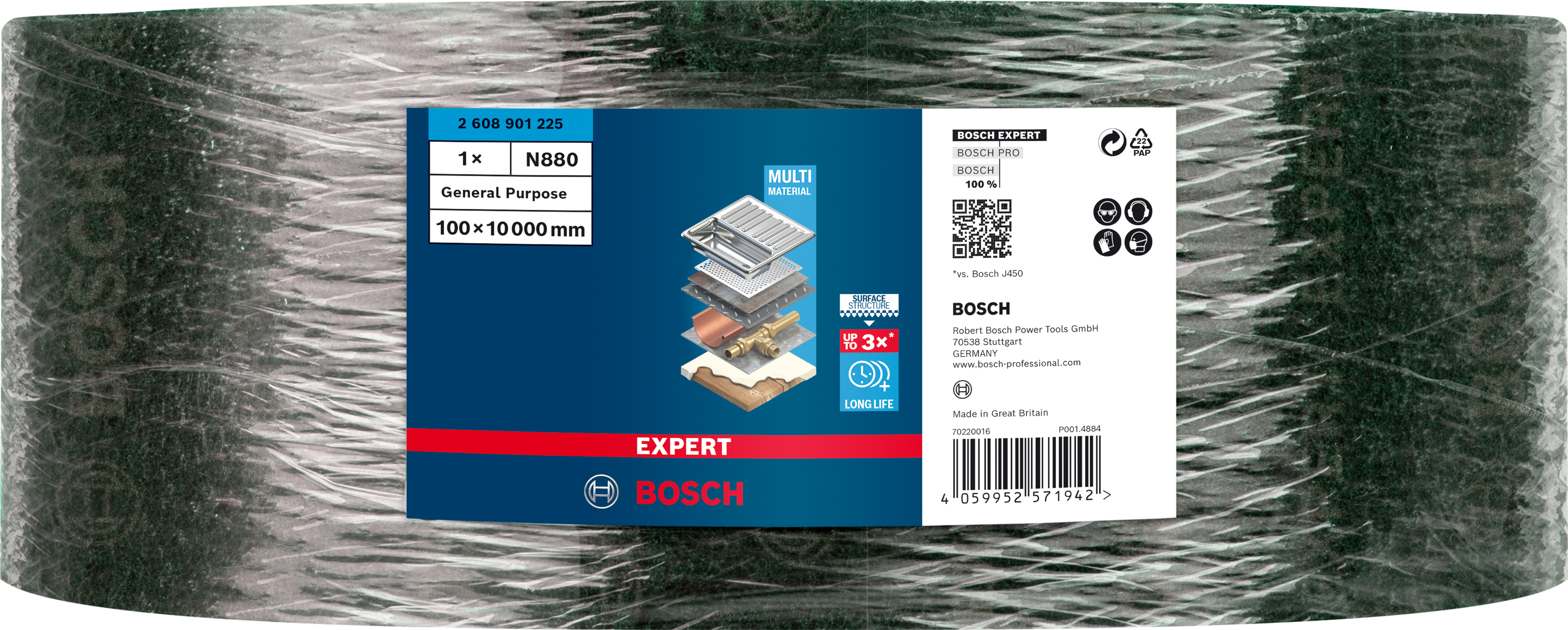 Emballage: 1 Marque: Bosch Référence: 2608901225 EAN: 4059952571942 Description: EXPERT Rouleau abrasif en non-tissé, Expert for finish polyvalent, 10 m x 100 mm